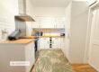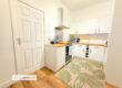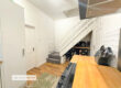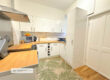 A modern fitted kitchen with sleek white gloss cabinetry complemented by Oak worktops. The space includes integrated storage, a built-in wine rack, tiled splash backs, and ample room for everyday appliances and provides access to the first-floor and utility room.