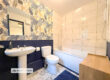 A stylish and contemporary bathroom featuring a white three-piece suite including a panelled bath with overhead shower, pedestal wash basin, and WC. The room is finished with attractive patterned floor tiles, navy half-panelling, and tropical-print wallpaper adding a touch of modern flair.