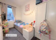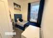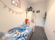 A well-presented single bedroom with bright décor and a cosy atmosphere, ideal for a child’s room or guest accommodation. Features soft carpeting, and a window allowing natural light to fill the space.