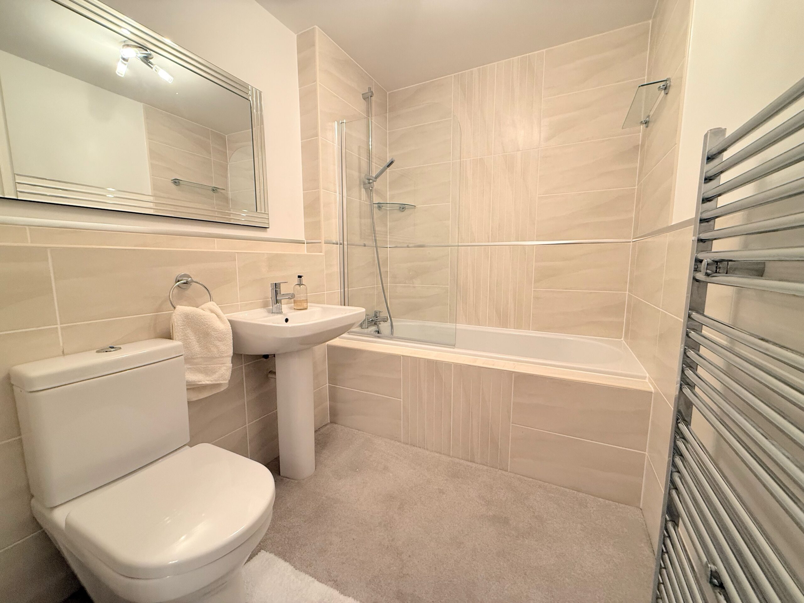 Modern matching 3 piece bathroom suite with shower over the bath. Heated towel rail and floor to ceiling tiles.