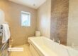 Bathroom – 2.56m x 1.42m – Fully tiled bathroom with shower over bath, pedestal wash hand basin, low-level WC, and heated towel rail.