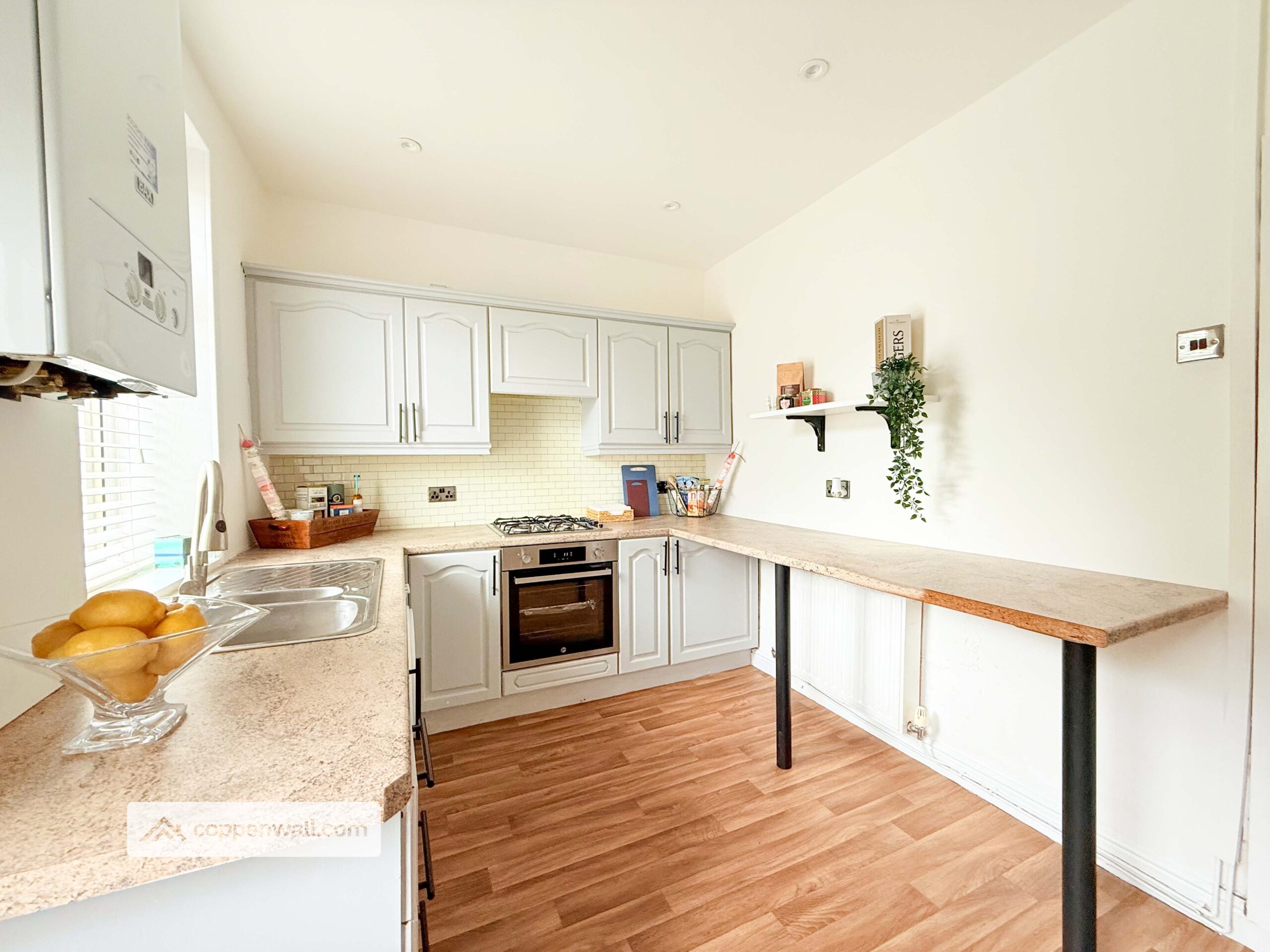 Kitchen – 4.32m x 2.59m – Modern fitted kitchen with wall and base units, complementary work surfaces, integrated electric oven, four-ring gas hob with extractor, plumbing for washing machine, and access to the rear garden.