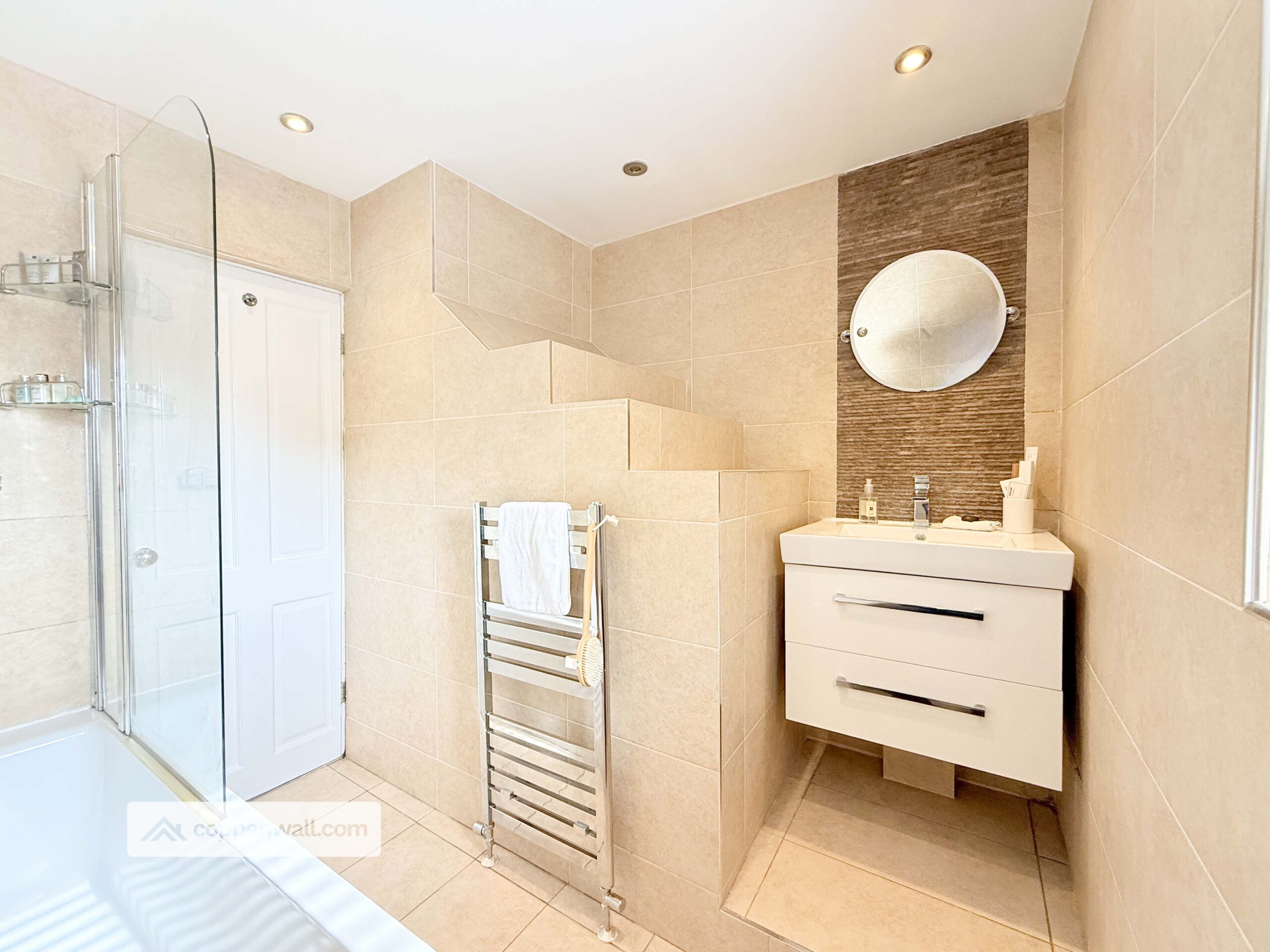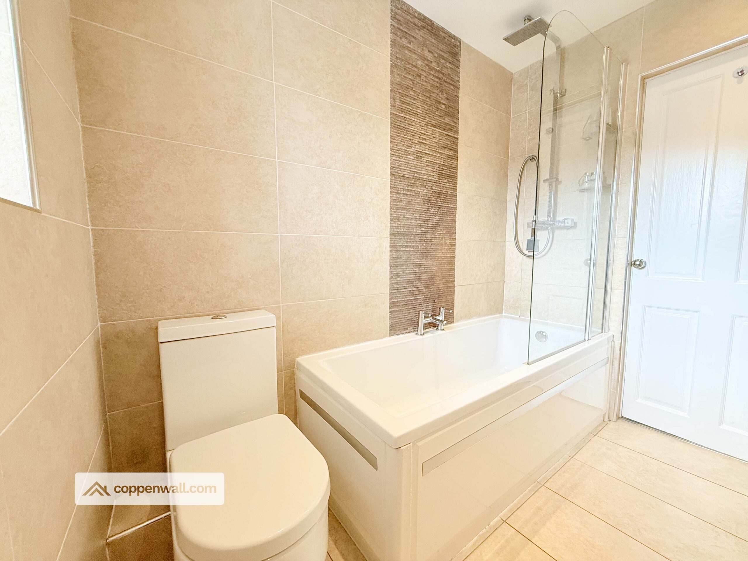 Bathroom – 2.56m x 1.42m – Fully tiled bathroom with shower over bath, pedestal wash hand basin, low-level WC, and heated towel rail.