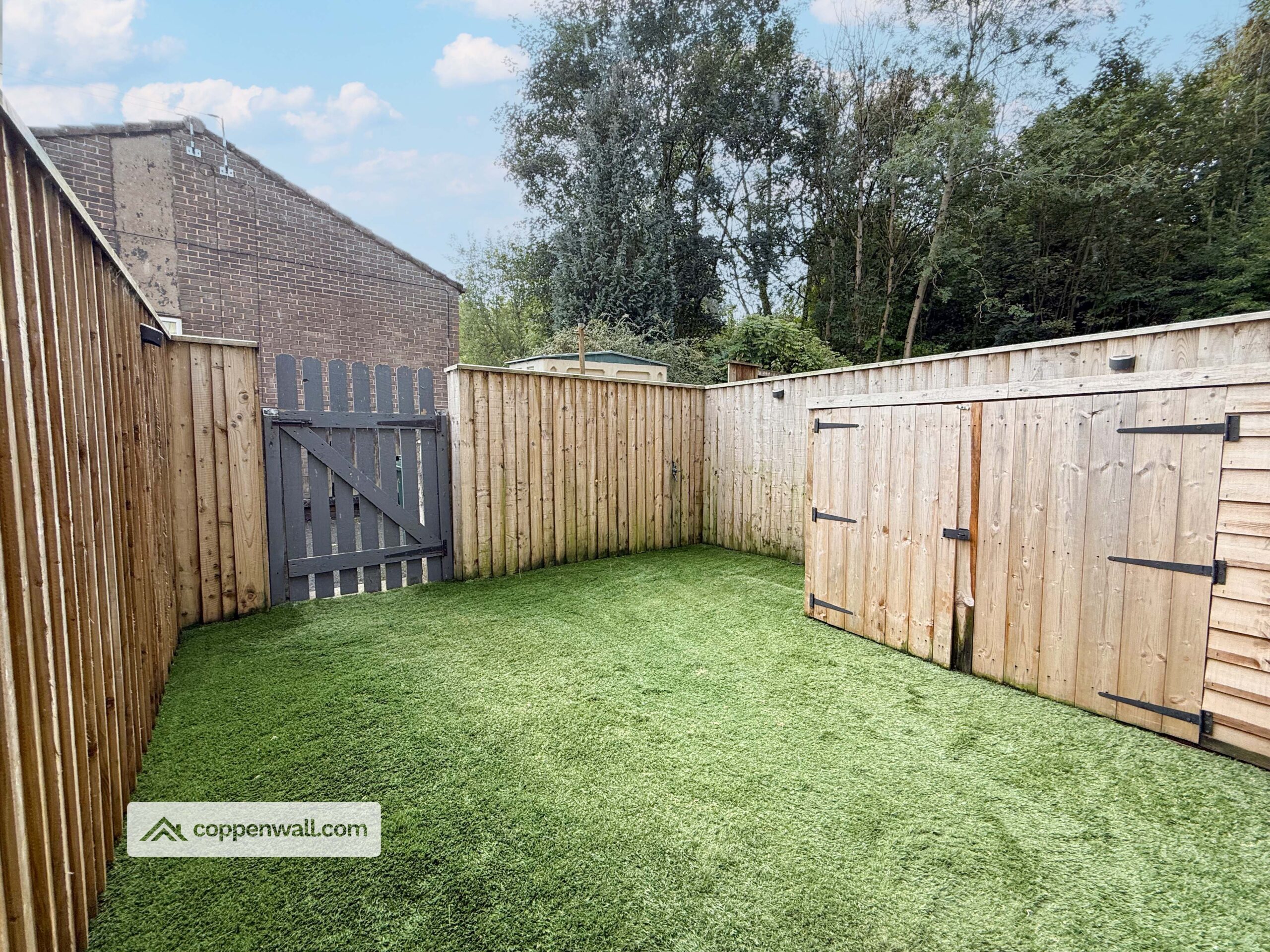 The front offers a smart courtyard-style garden with iron gate, while the rear enjoys an enclosed low-maintenance artificial lawn and a useful storage shed.