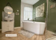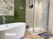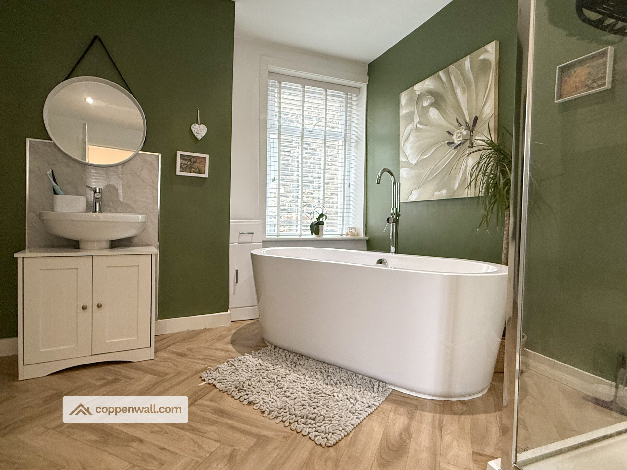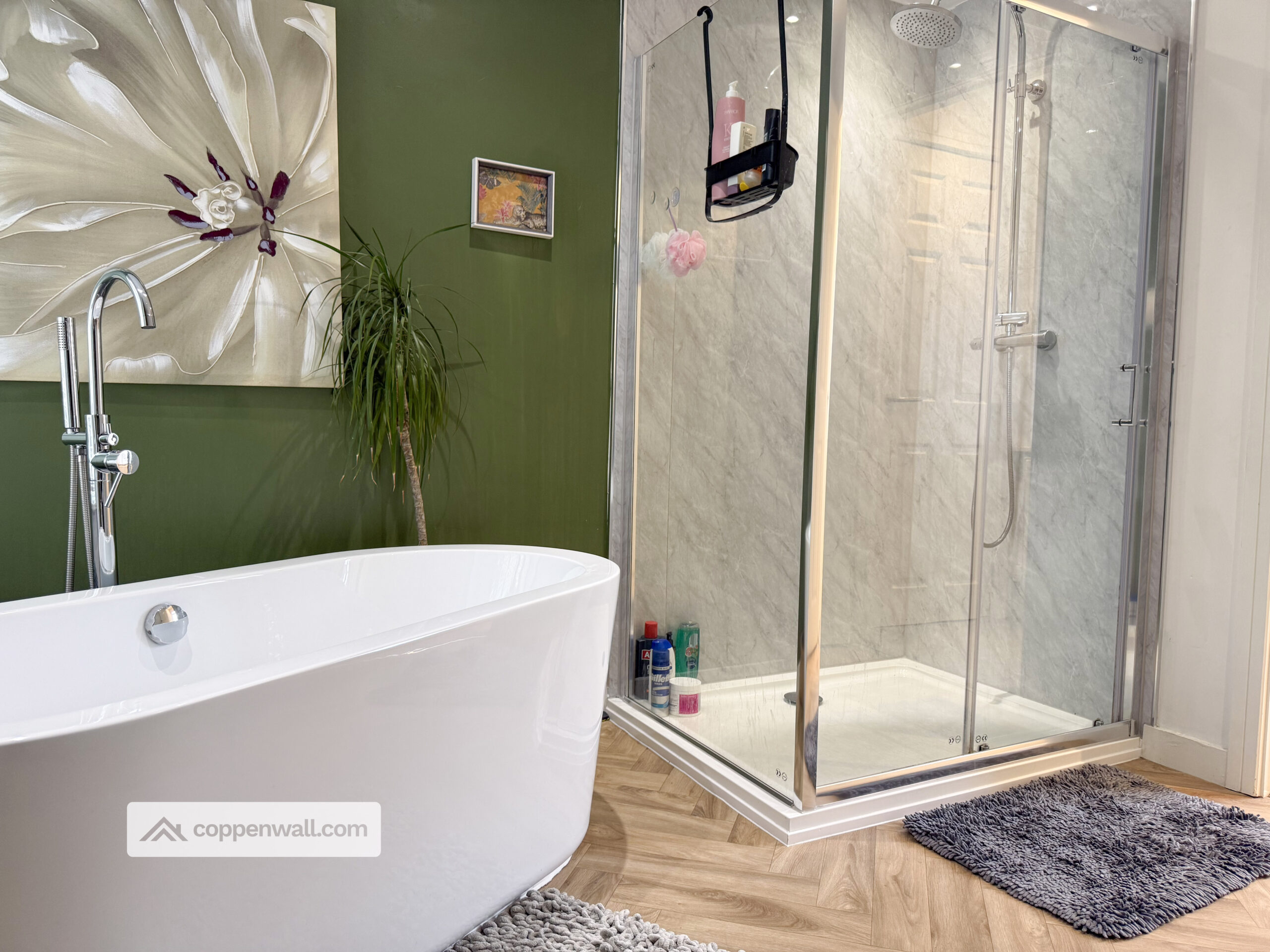 A stylish four-piece suite featuring a freestanding bath, separate shower enclosure, wash basin and WC — blending practicality with a touch of luxury.