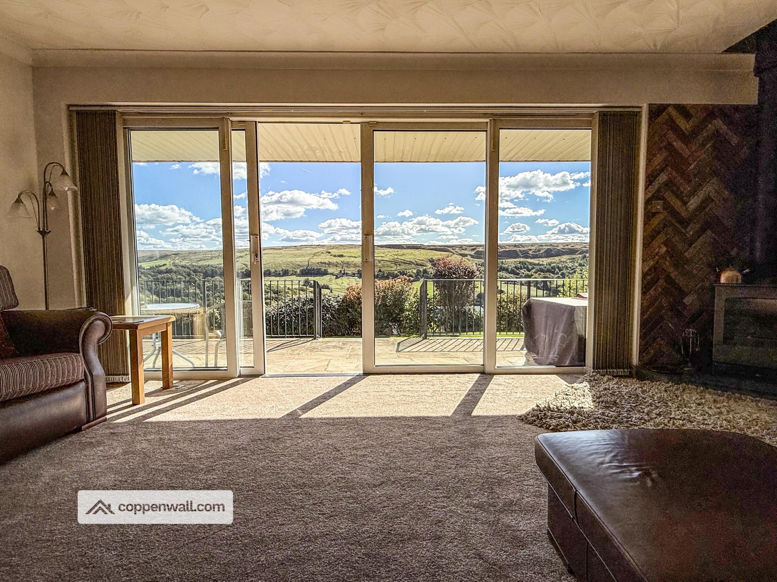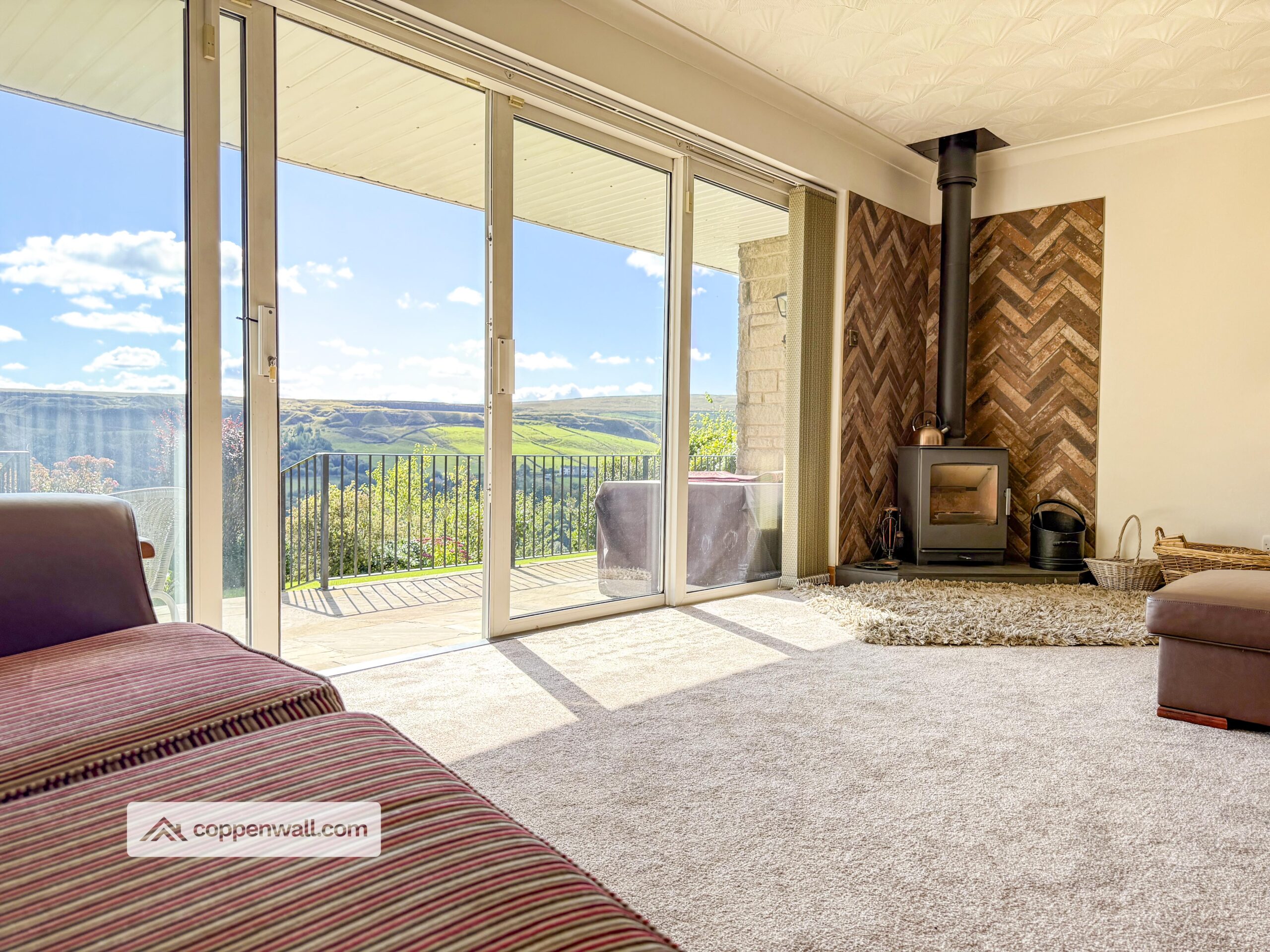 Absolutely stunning picturesque valley views from the large sliding doors / windows. Multi fuel stove (swept annually). Very spacious room with access to the rear patio, kitchen and bedrooms.