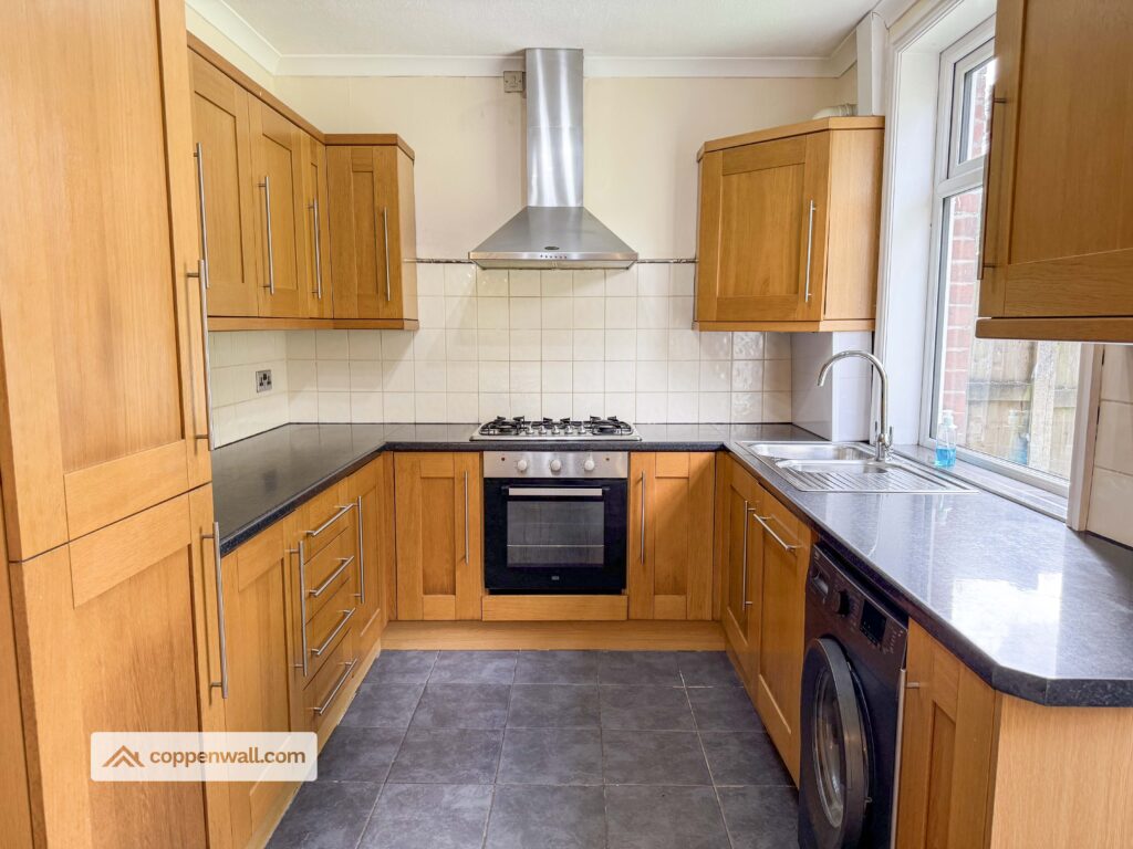 Open plan dining modern solid wood kitchen, built in appliances such as: Fridge, Freezer, Dishwasher, Single oven and 5 ring gas hob. Access to under stairs storage, and the rear patio area.