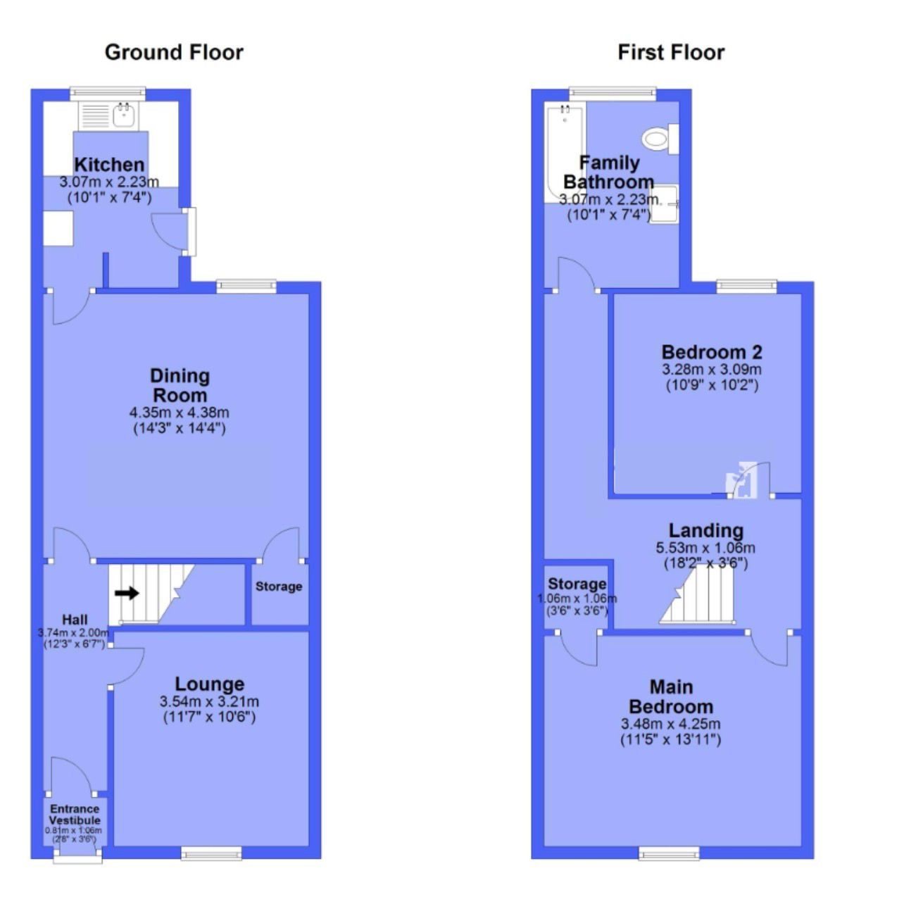 To the first floor are two well-proportioned bedrooms, both capable of accommodating double beds, along with a modern family bathroom fitted with a three-piece suite and shower over the bath.