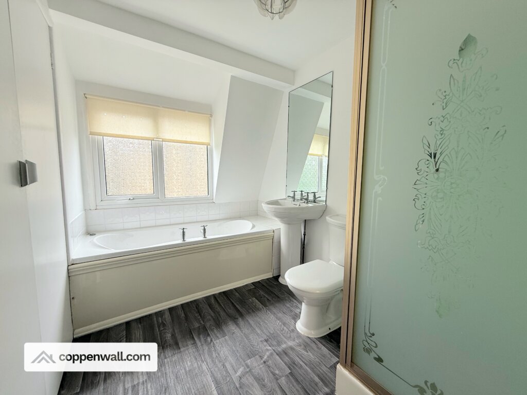 Contemporary four-piece suite with bath, separate shower, wash basin, and W/C.