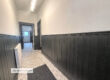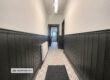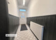 A welcoming entrance hall featuring decorative flooring, black panelling, and a modern neutral finish leading through to the main reception area, stairs and kitchen.
