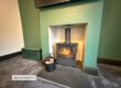 A bright and cosy lounge with a contemporary green feature wall, modern décor, and a wood-burning stove set into a chimney breast alcove. Finished with plush carpet, modern light fittings, and a large front-facing window allowing plenty of natural light.
