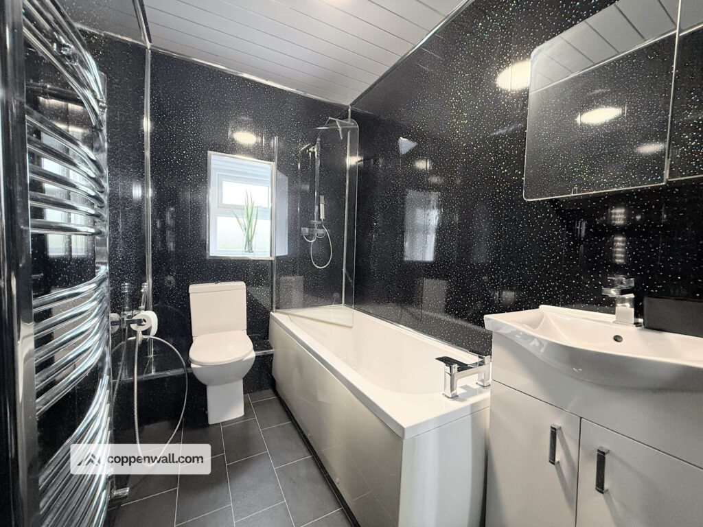 A contemporary family bathroom fitted with a white three-piece suite including a panelled bath with overhead shower, WC, and wash basin with vanity storage. Finished with black sparkle wall panels, a heated chrome towel rail, and modern grey flooring.
