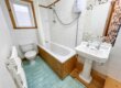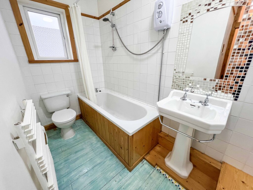 Matching 3 piece bathroom suite with shower over bath and heated towel rail.