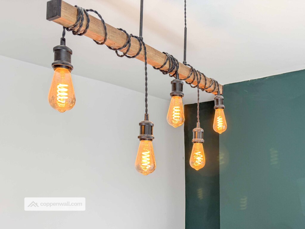 Good-sized dining area with feature ceiling lights and under stair storage.