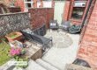 A mix of flagged area and stone path with lawns either side and a gate to access the backstreet. There's also a small brick store in the rear garden.