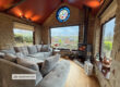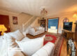 A stunning feature of the home, this light-filled room enjoys panoramic countryside views through large picture windows. Complete with a multi-fuel stove, exposed stone walls and wooden beams.