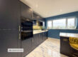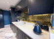 Recently updated to an extremely high standard, this contemporary open-plan kitchen and dining area features navy shaker-style cabinetry, quartz-worktops, a large central island with breakfast bar seating, and integrated appliances including an oven, microwave, hob, dishwasher, and fridge/freezer. Finished with marble-effect tiled flooring, brass fittings, and spotlighting, the space opens into the rear reception room and offers an ideal layout for modern family living and entertaining.