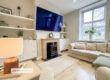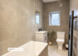 Stunning modern bathroom with heated towel rail, fully tiled walls and shower over bath.