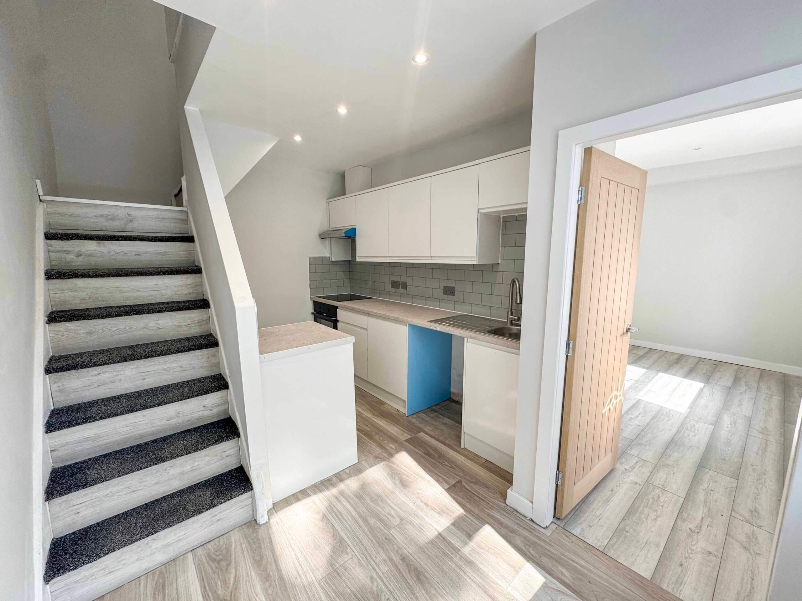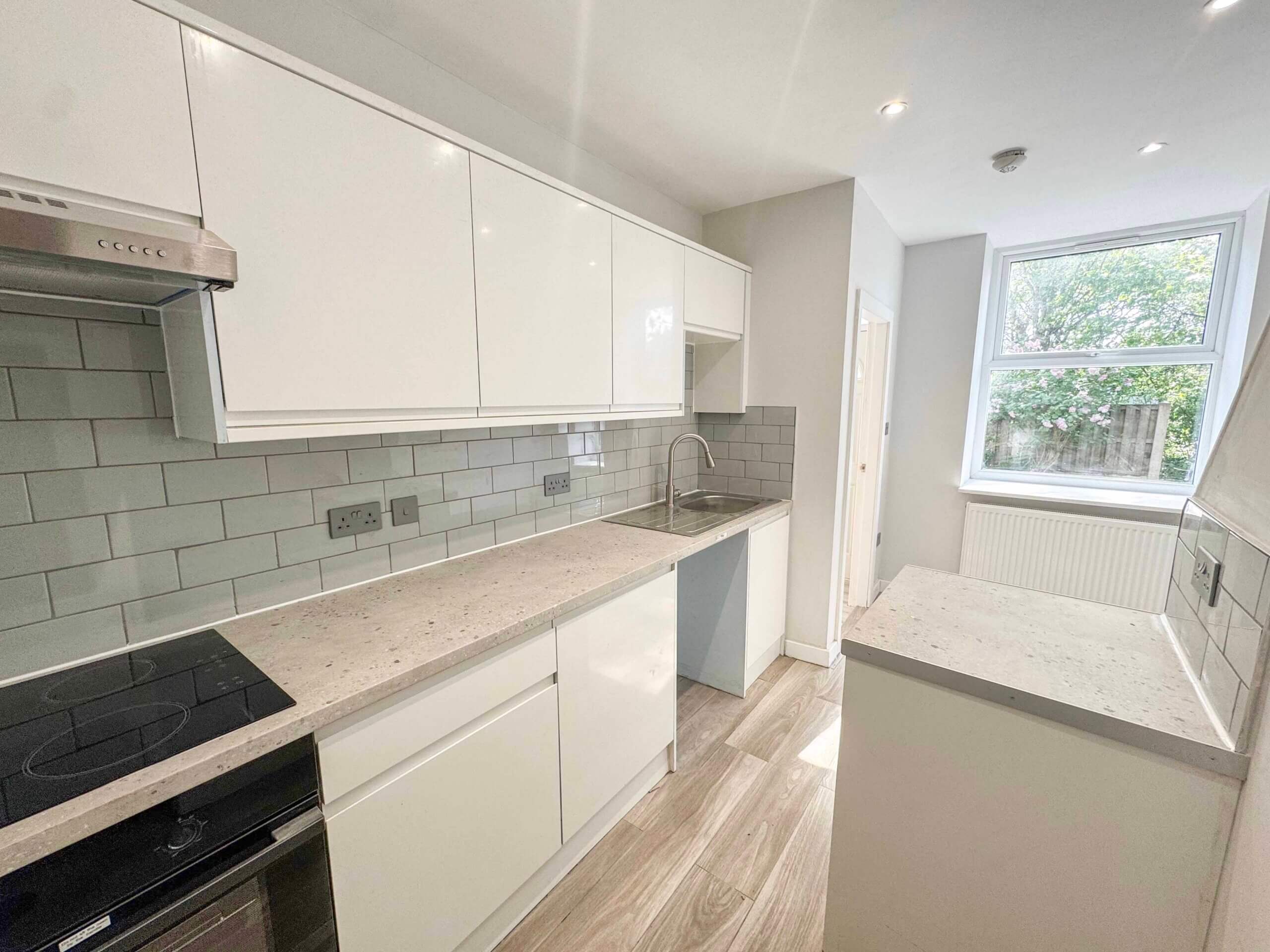 Modern kitchen with lots of storage cupboards and a brand-new oven and hob. Access into the cellar. Space