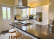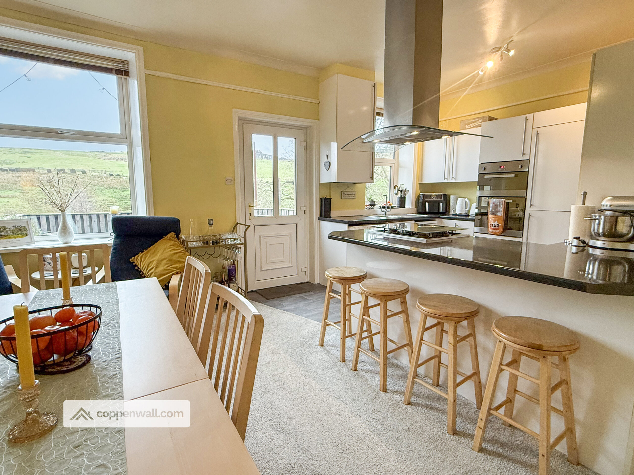 A stylish and practical family kitchen fitted with an integrated fridge/freezer, double oven, and four-ring gas hob with extractor, with space for a freestanding washing machine and dishwasher. The window over the sink enjoys open countryside views, while a breakfast bar provides seating for two to three people. A rear door leads directly to the garden, ideal for modern family living and entertaining.