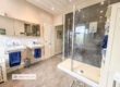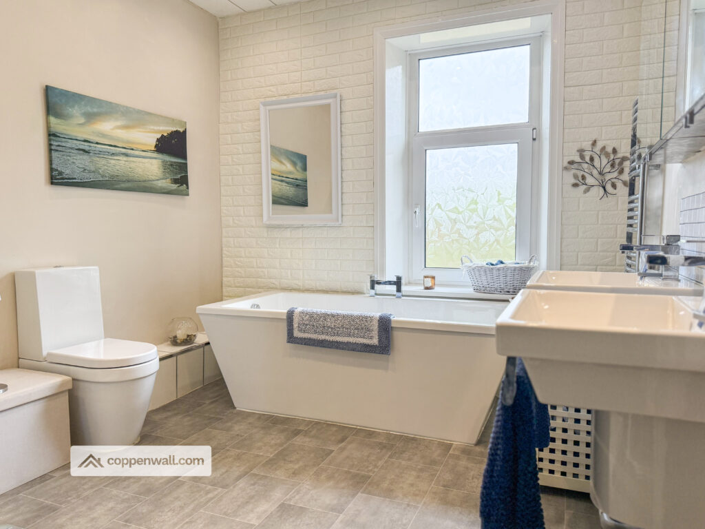 A luxurious five-piece family bathroom comprising twin wash basins, a large bathtub, WC and a separate shower cubicle fitted with a powerful electric shower and glass screen.