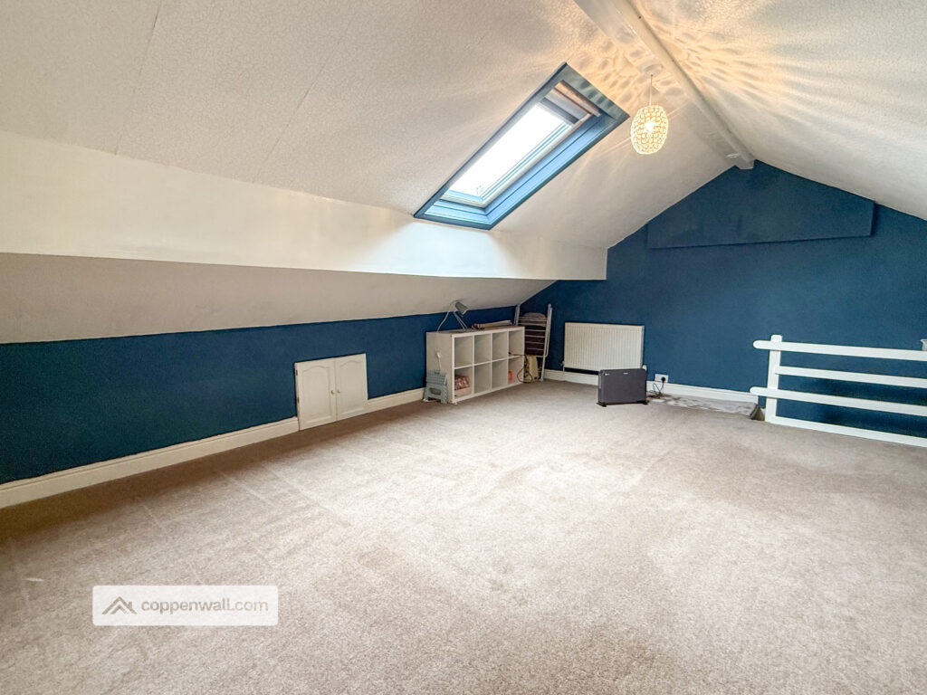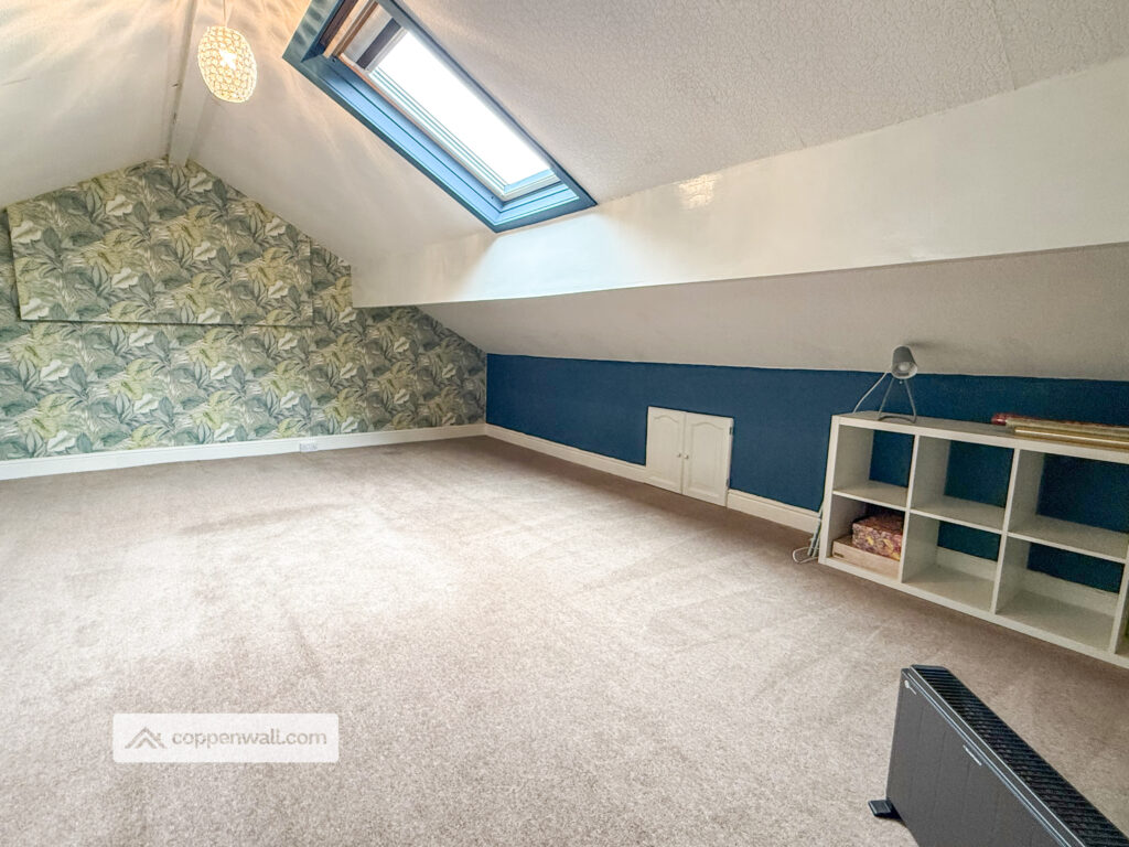 A substantial upper-floor bedroom featuring a large Velux window that floods the room with natural light, along with a central heating radiator, making it ideal as a teenager’s bedroom, guest suite or additional living space.
