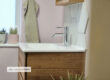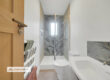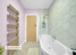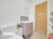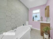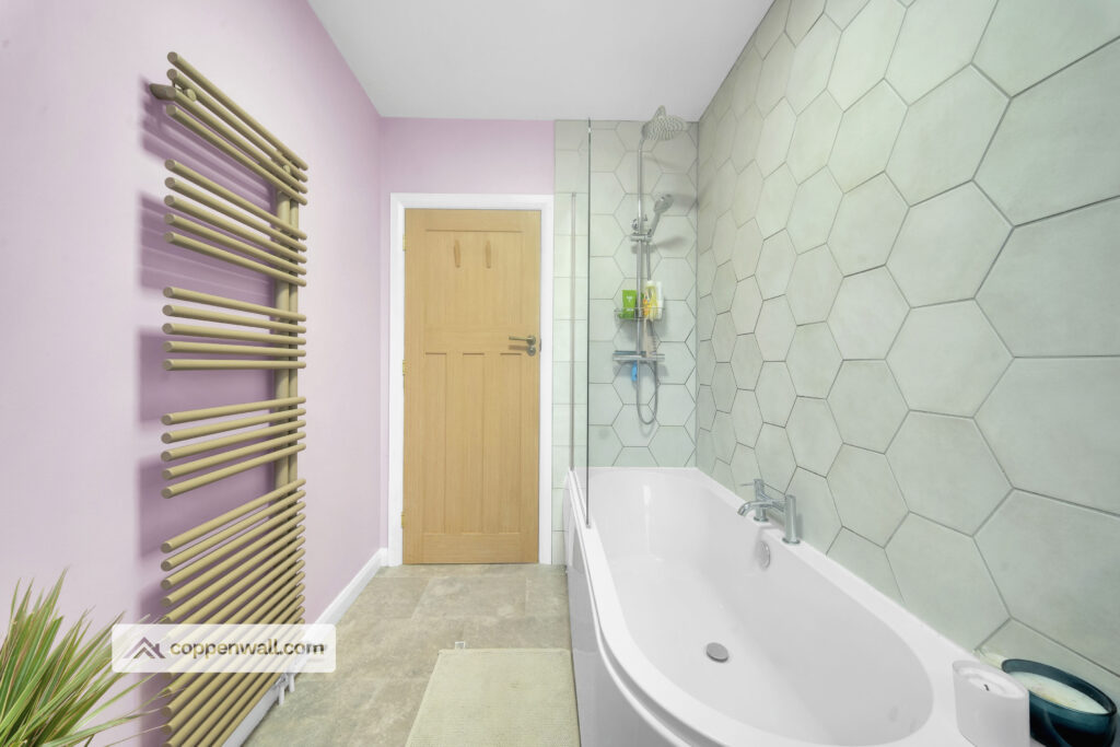 Modern three-piece suite in clean white, complemented by stylish grey hexagonal tiling, vanity sink unit with cupboard below and heated towel rail for added comfort.