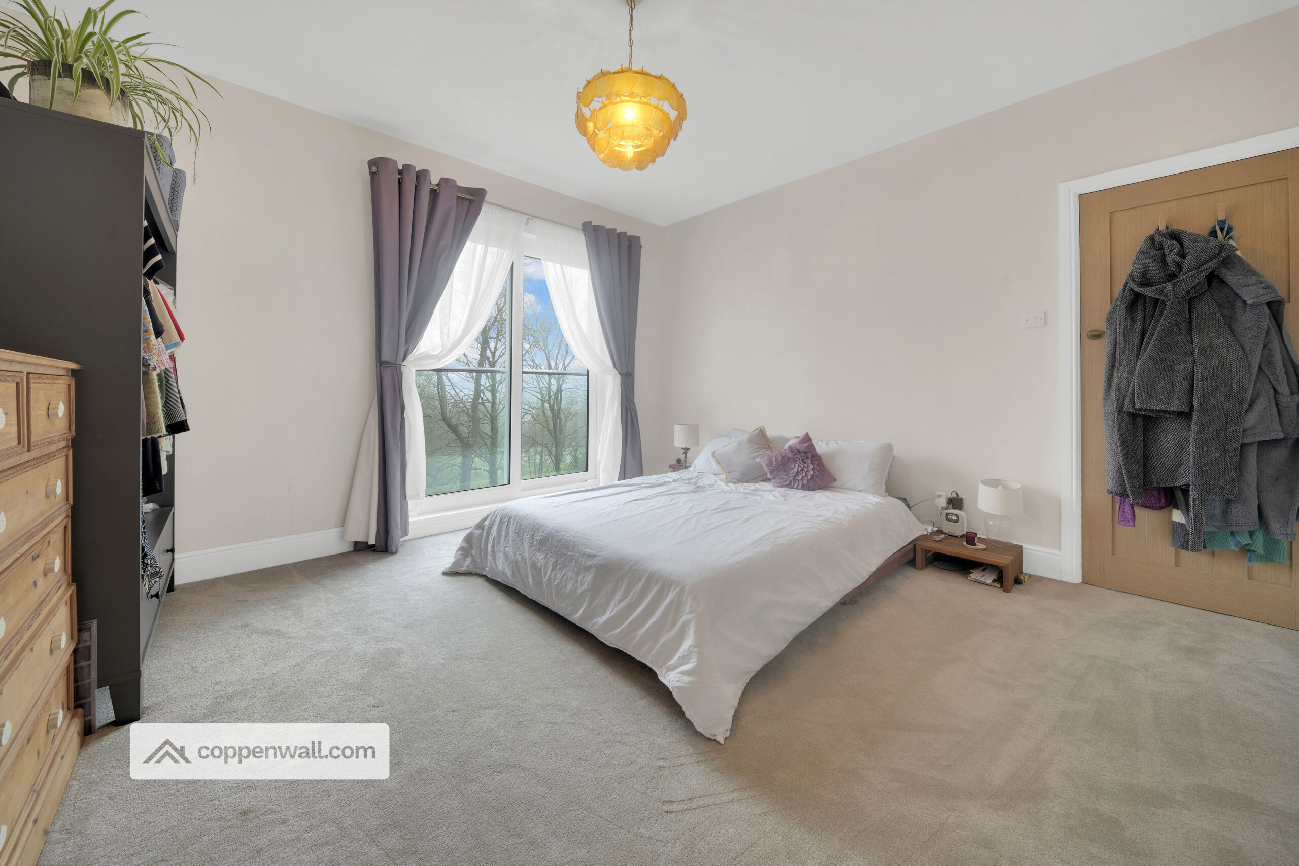 A truly standout feature of the home, this impressive bedroom benefits from a contemporary glass balustrade and patio doors opening to breathtaking countryside views across the hillside.
