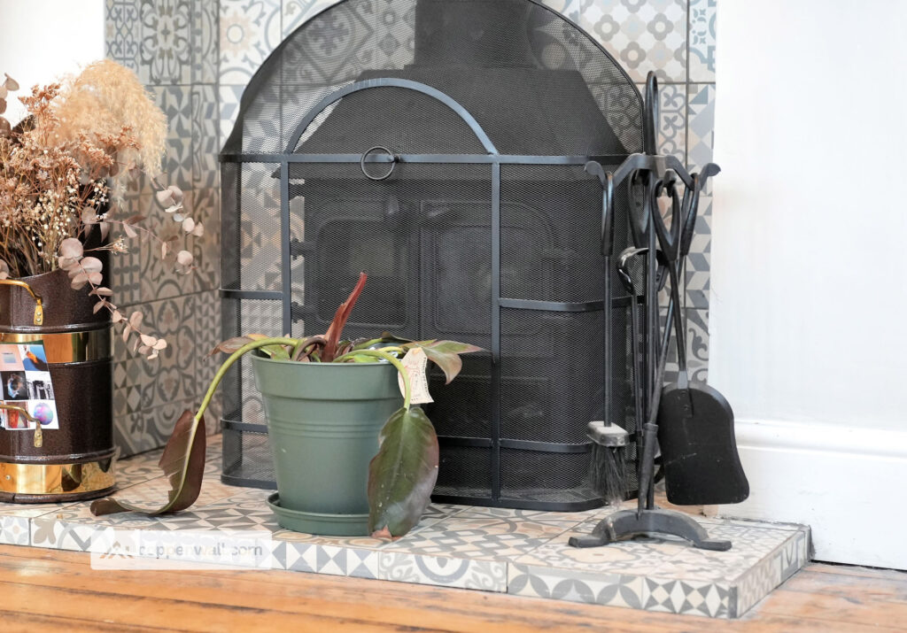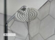 Modern shower room fitted with a white three-piece suite and floral tile accents, creating a stylish and elegant finish.