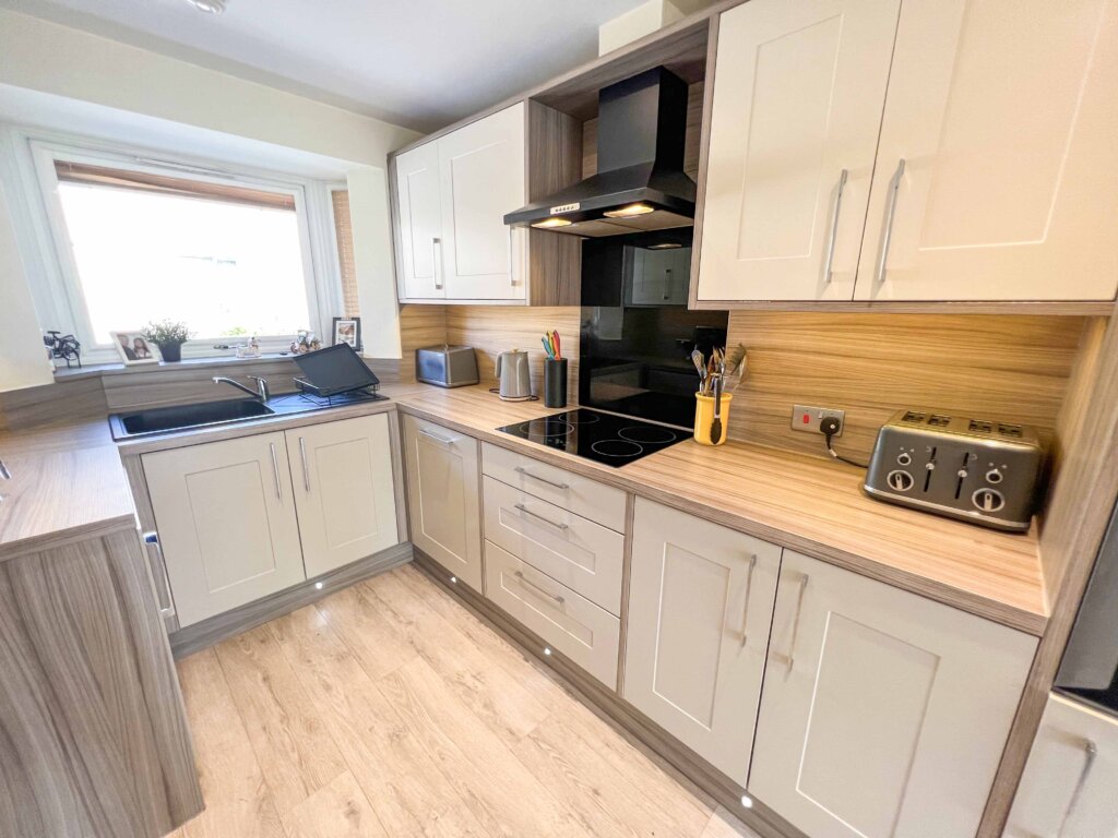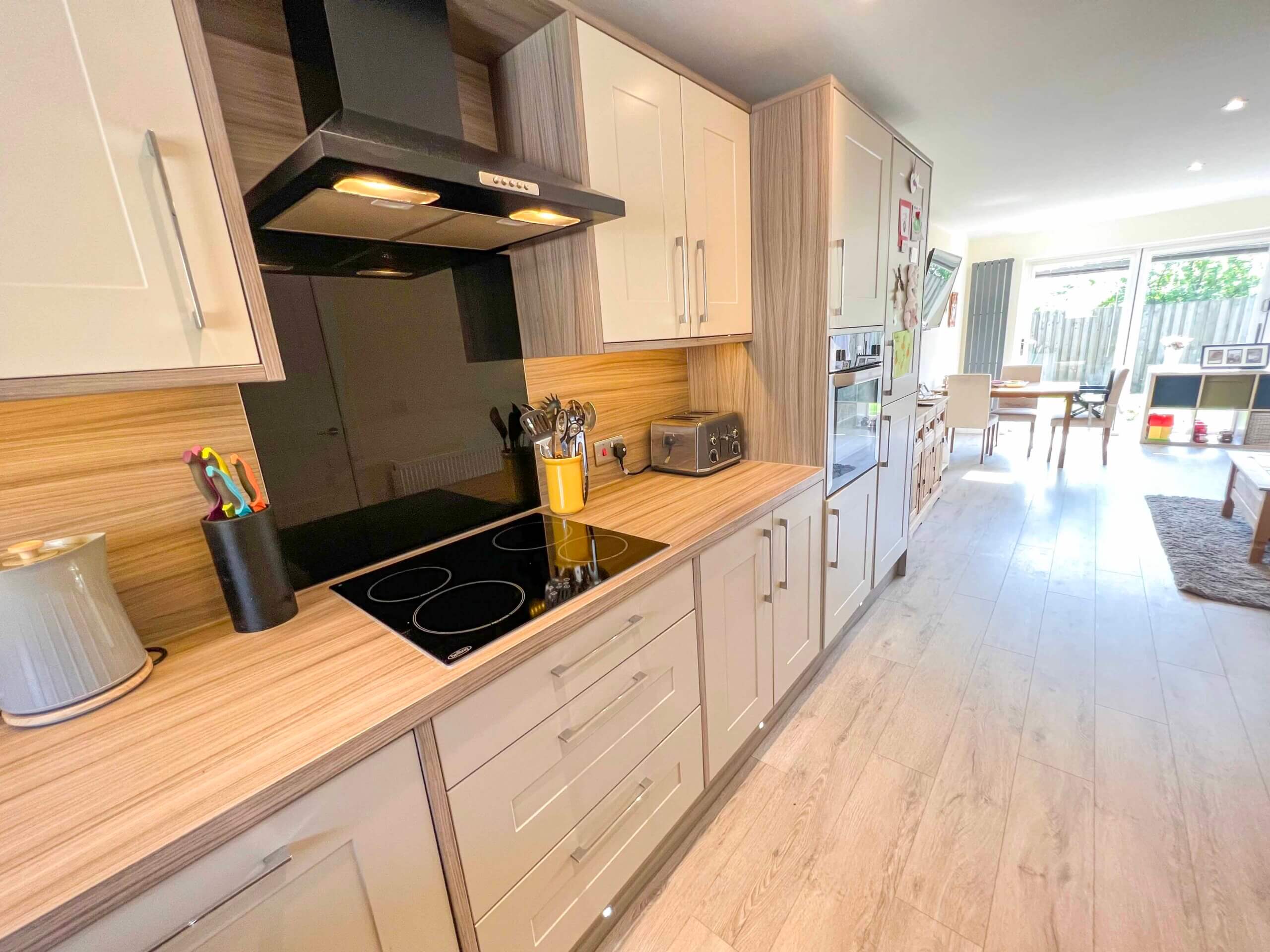 Integrated: Fridge, Freezer, Washing Machine, Dishwasher, 4 ring induction hob. Counter and plinth spotlights.