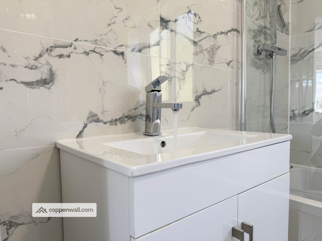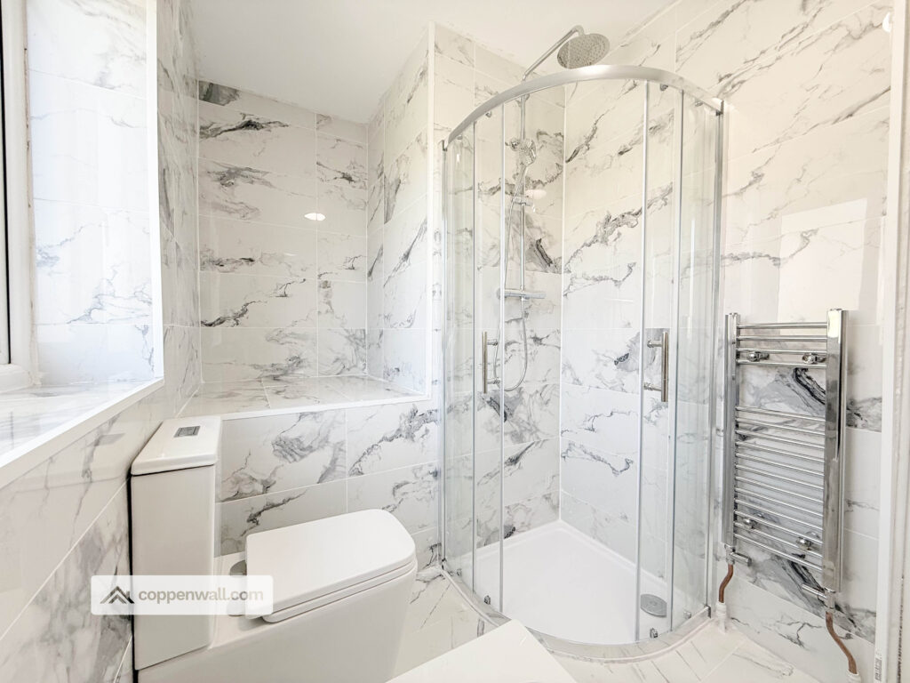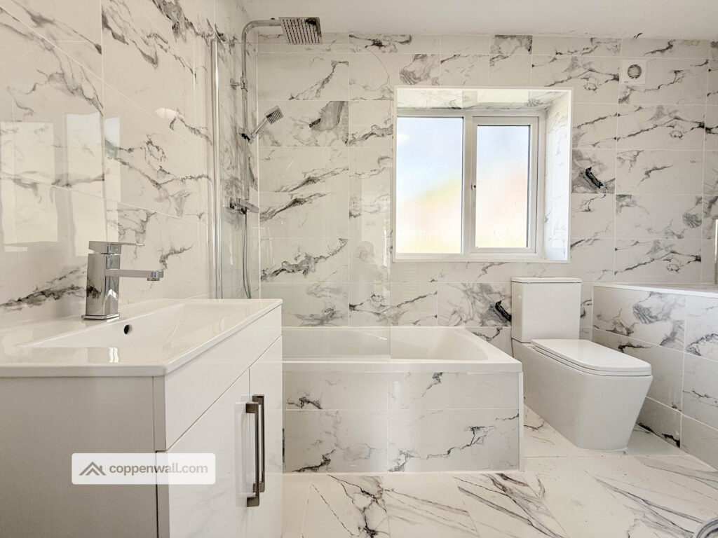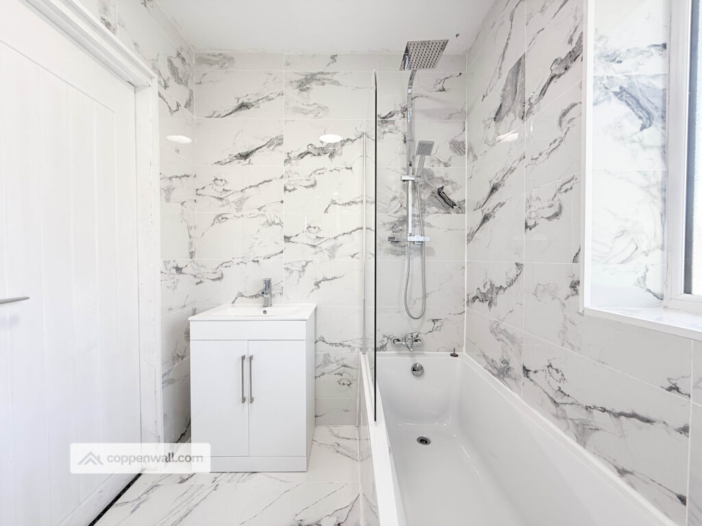 A real highlight of the home is the stunning family bathroom, fully tiled and fitted with a stylish four-piece suite comprising a panelled bath, separate walk-in shower, WC, and vanity wash basin, all complemented by a modern heated towel rail, creating a clean and luxurious space.