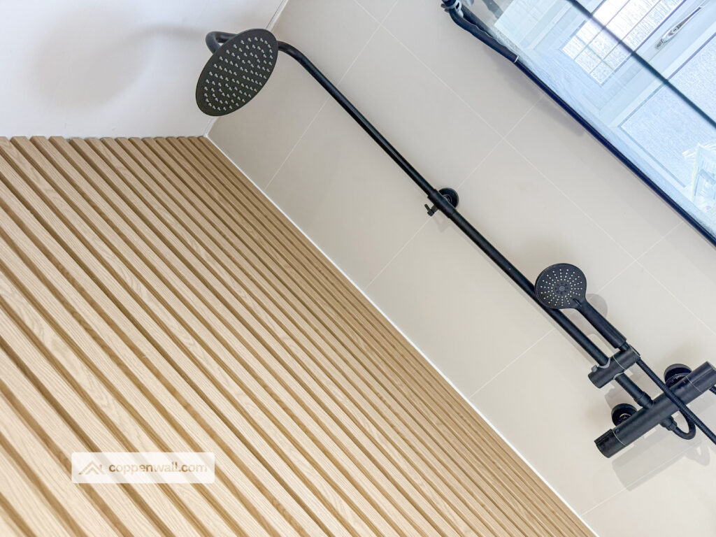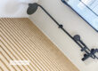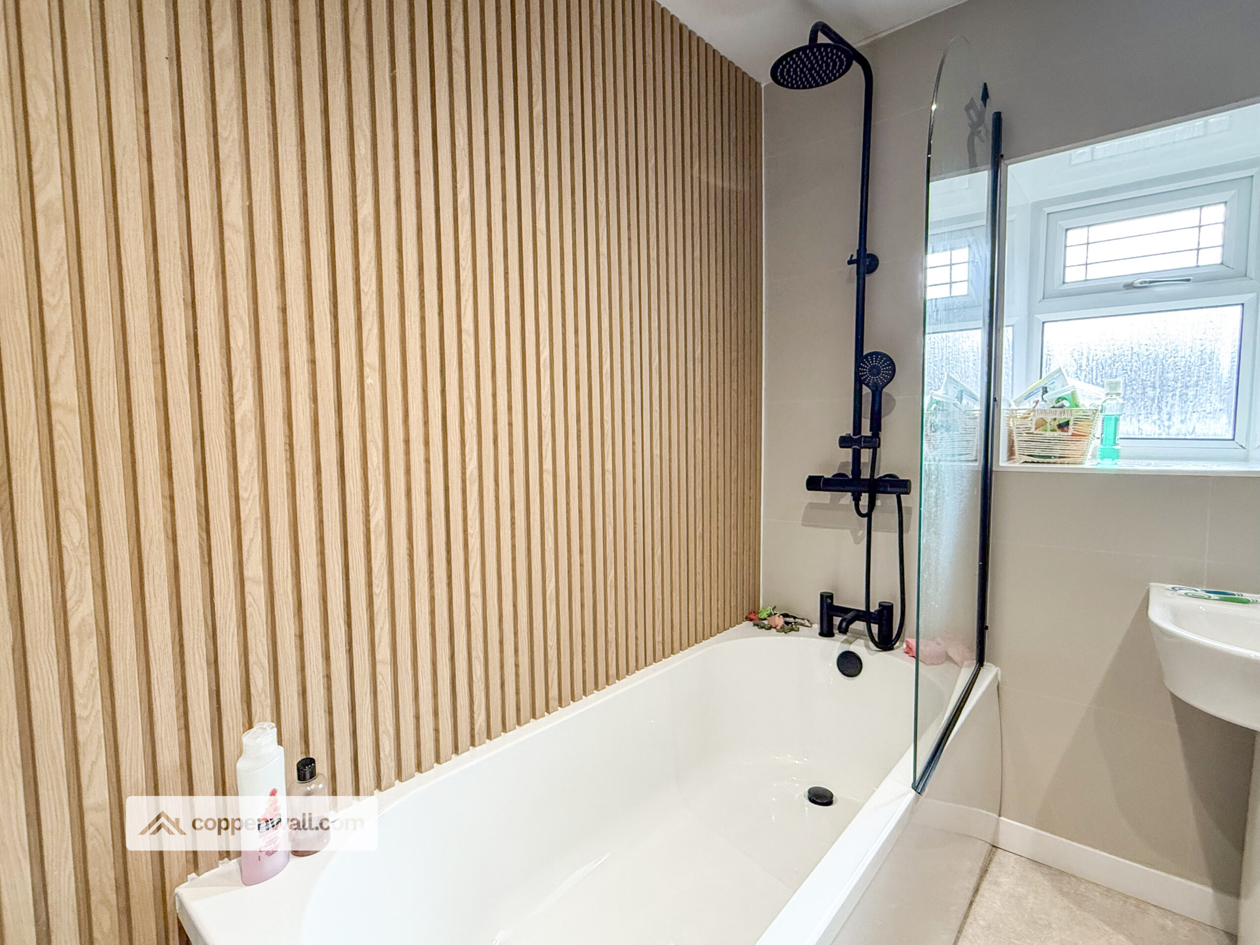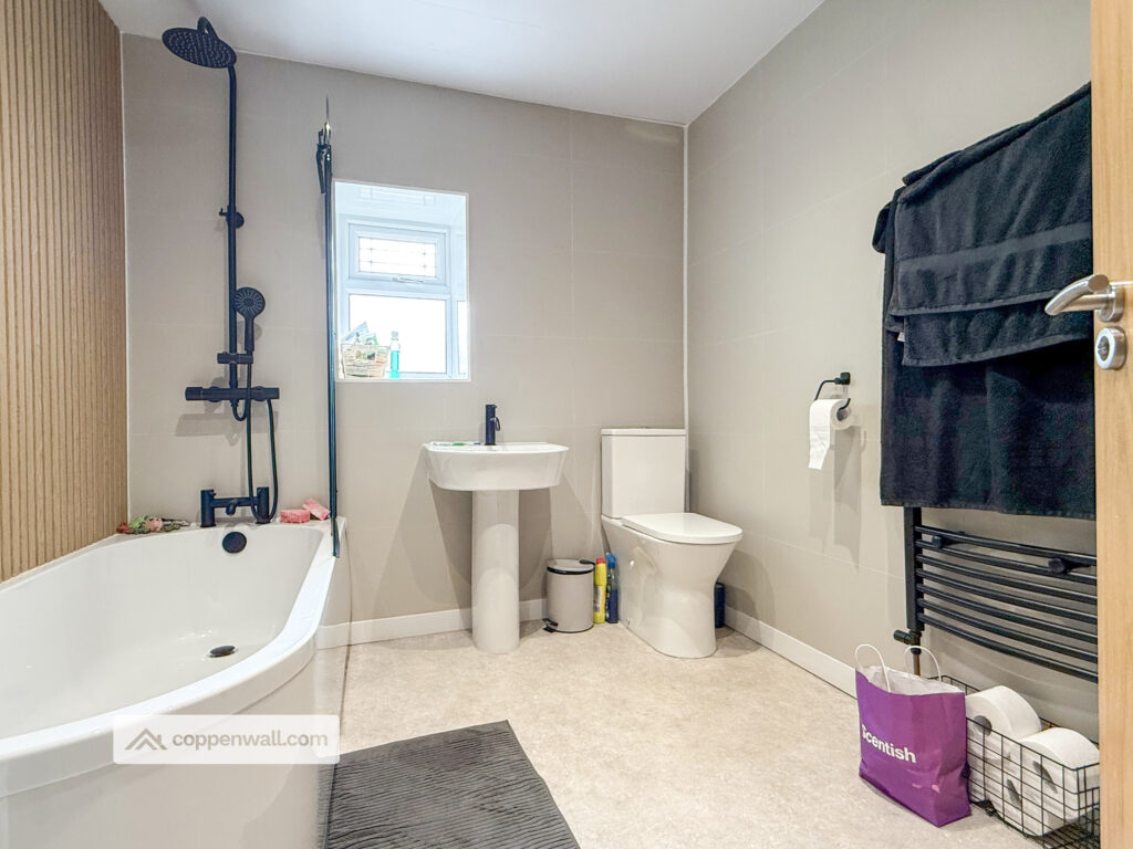 A modernised bathroom featuring a heated towel rail and frosted window, combining comfort with privacy.