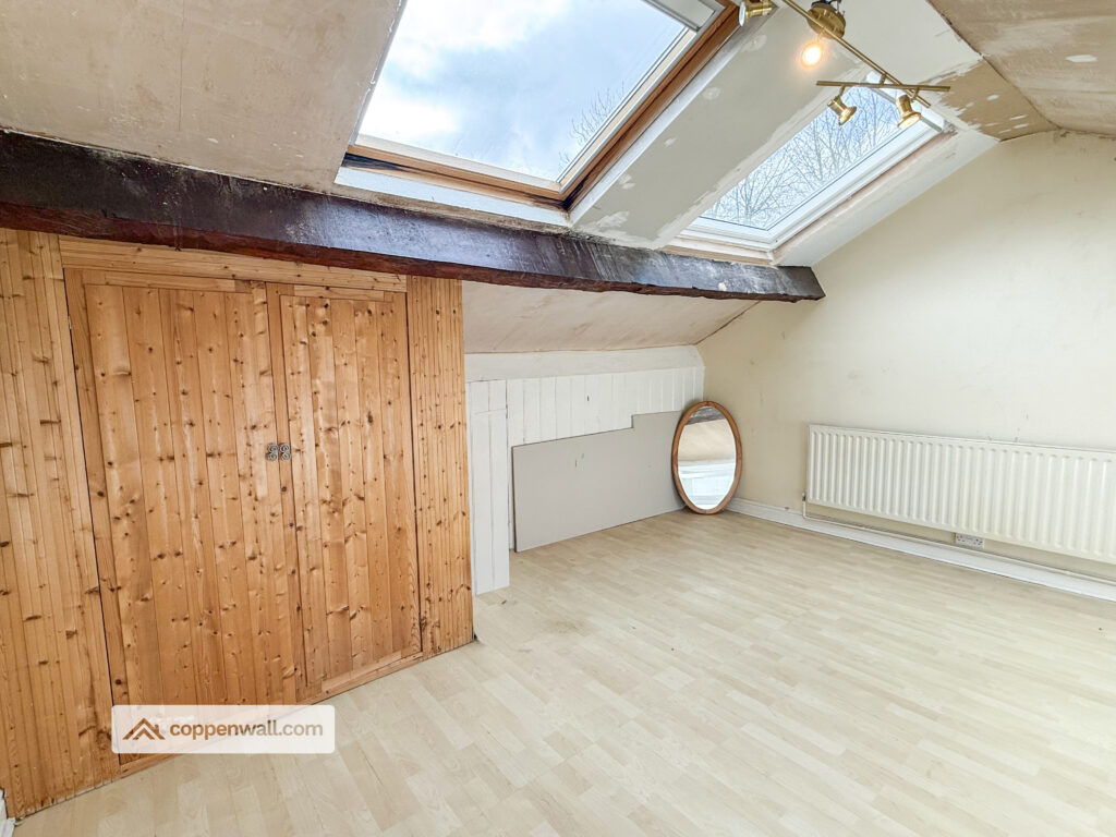 A spacious third bedroom characterised by charming exposed beams, built-in storage, and an abundance of natural light from twin Velux windows and a traditional double-glazed window.