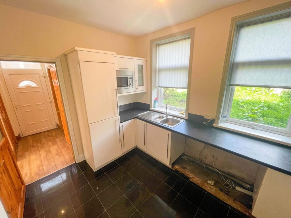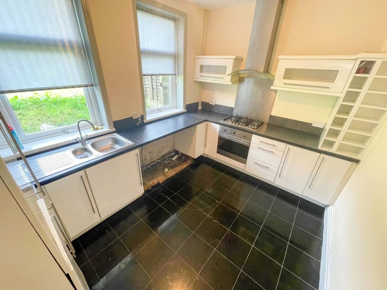 Two UPVC double-glazed window, central heating radiator, white gloss wall and base units, laminate worktops, stainless steel 1 1/2 sink and drainer and mixer tap, oven, five ring gas hob and extractor hood, fridge/freezer, plumbing for washer, tiled floor, stainless steel splash back and built in microwave.