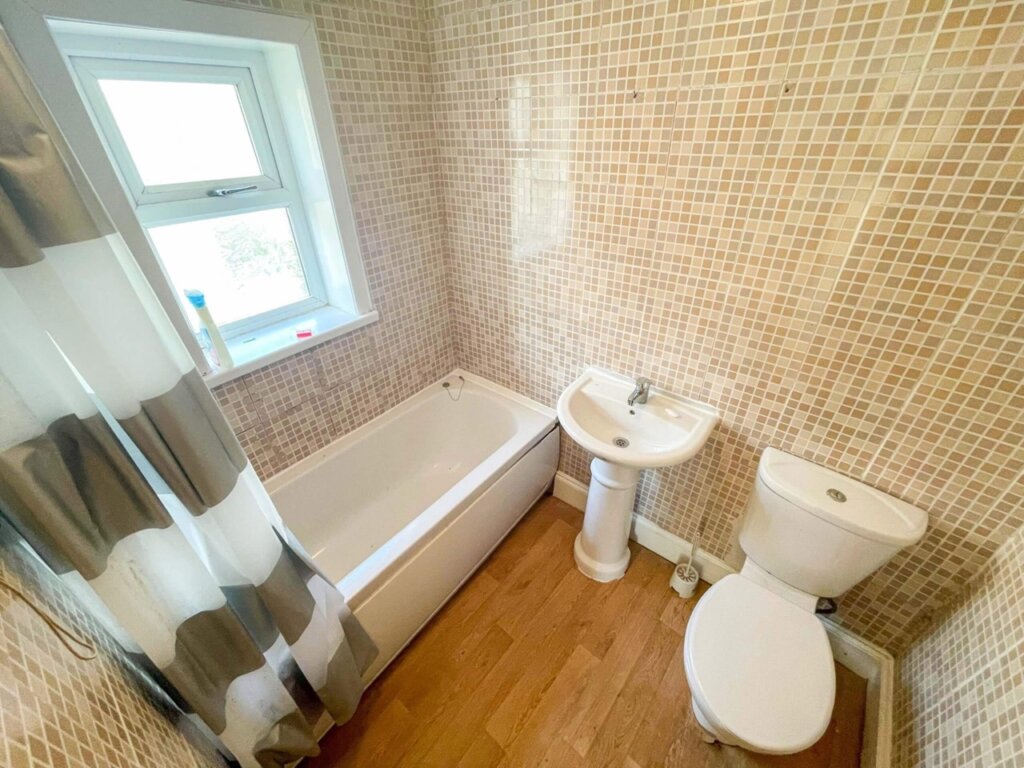 UPVC double-glazed window, central heating towel radiator, three-piece suite, double flush WC, pedestal wash basin and mixer tap, panel bath and mixer tap, electric shower and tiled elevation floor.