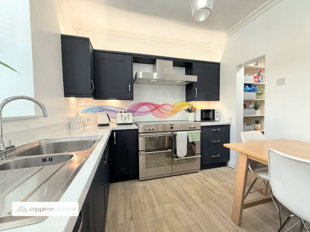 The modern kitchen is fitted with new blue units, a built-in oven, extractor, dishwasher, and a colourful feature splash back. Upstairs, the bathroom has been upgraded with a marble tile finish and a rainfall shower head for a touch of luxury.
