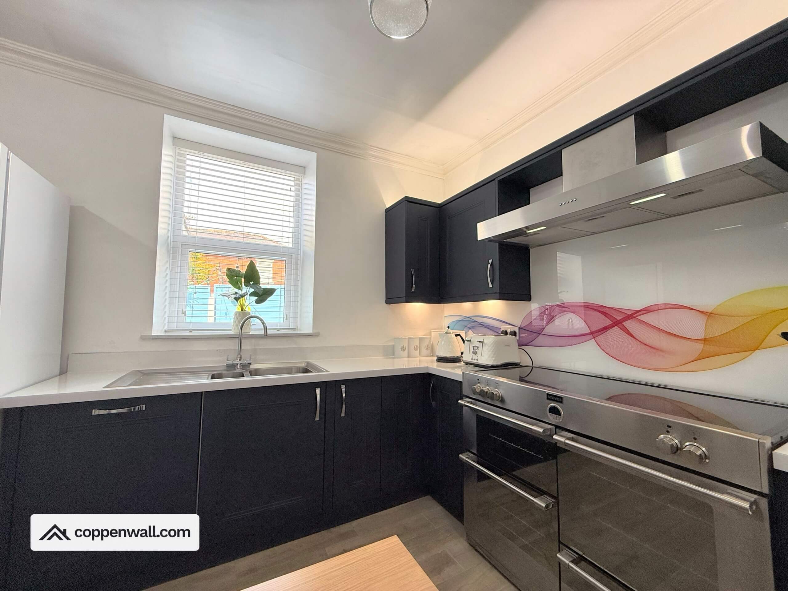 The modern kitchen is fitted with new blue units, a built-in oven, extractor, dishwasher, and a colourful feature splash back. Upstairs, the bathroom has been upgraded with a marble tile finish and a rainfall shower head for a touch of luxury.