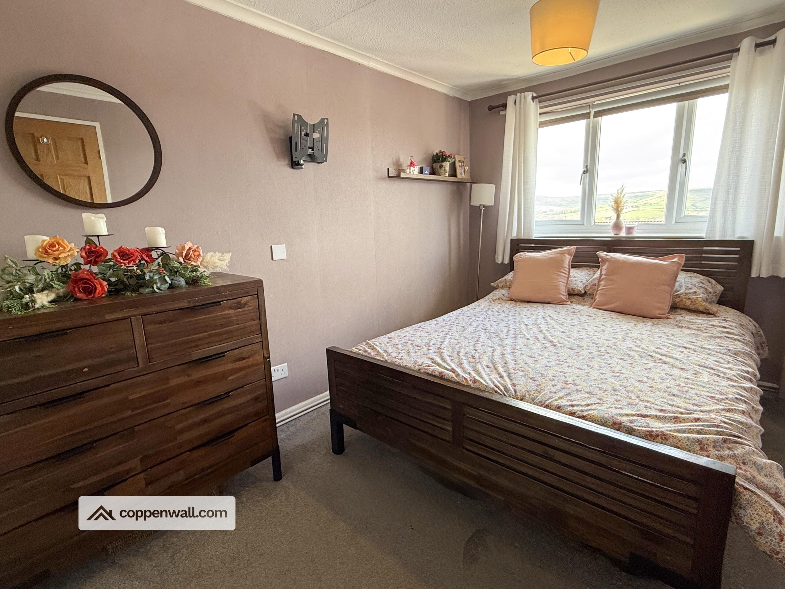 A spacious double bedroom featuring built-in storage and pleasant views, offering a calm retreat at the end of the day.