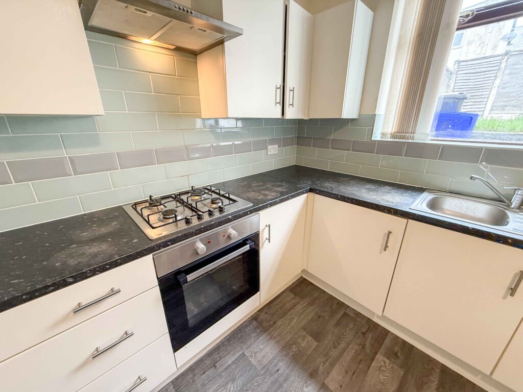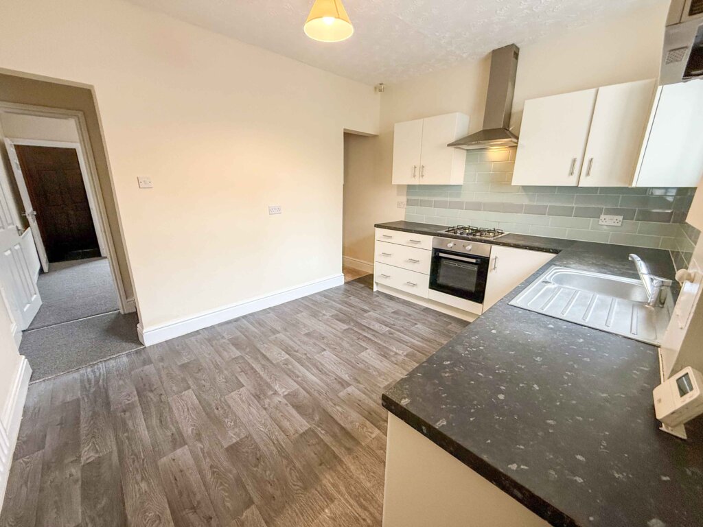 Dining kitchen with built-in single oven and 4 ring gas hob. There's space for a fridge freezer, an under stair storage nook and plumbing for a washing machine.