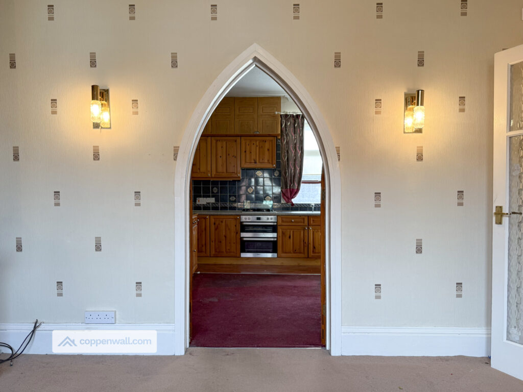 A well-proportioned reception room featuring a wooden double glazed window to the front elevation, radiator, television point, electric fire, and attractive arched double doors leading through to the kitchen diner.