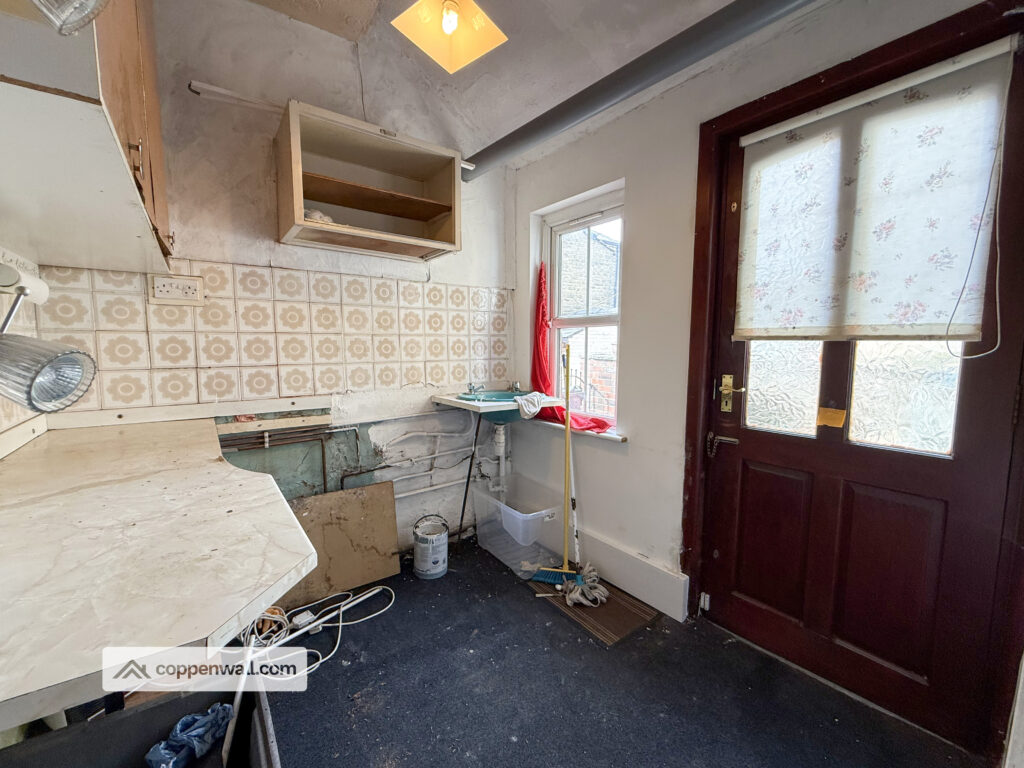 Offering space for appliances, wall-mounted boiler, wooden window, and external door to the side.