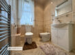 Comprising a four-piece suite in white including low-level WC, vanity sink unit, bidet, and step-in shower cubicle. Tiled to complement with radiator and wooden double glazed window.