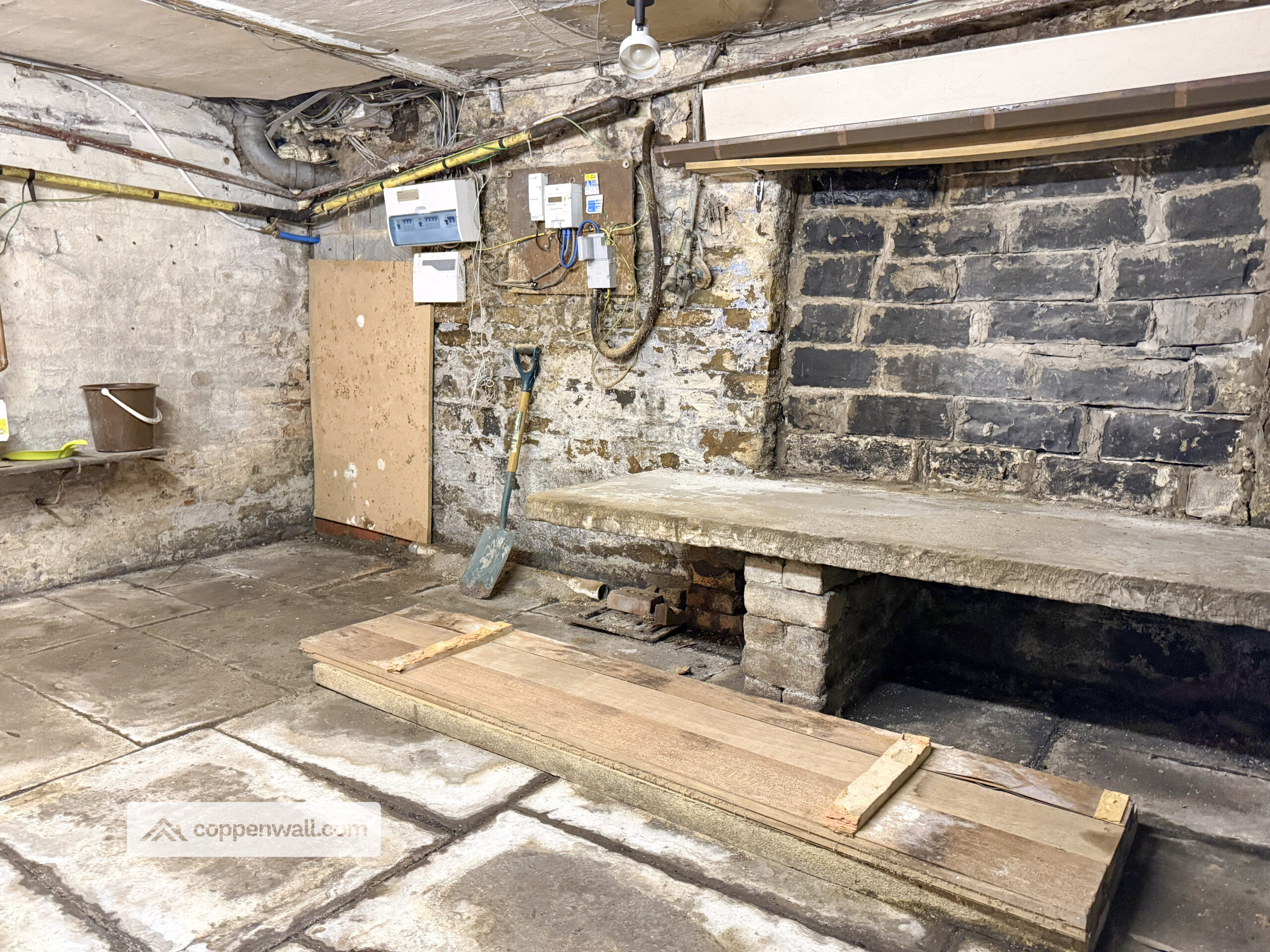 Useful storage space with stone flag flooring, stone bench, wall-mounted meters, and original fireplace.