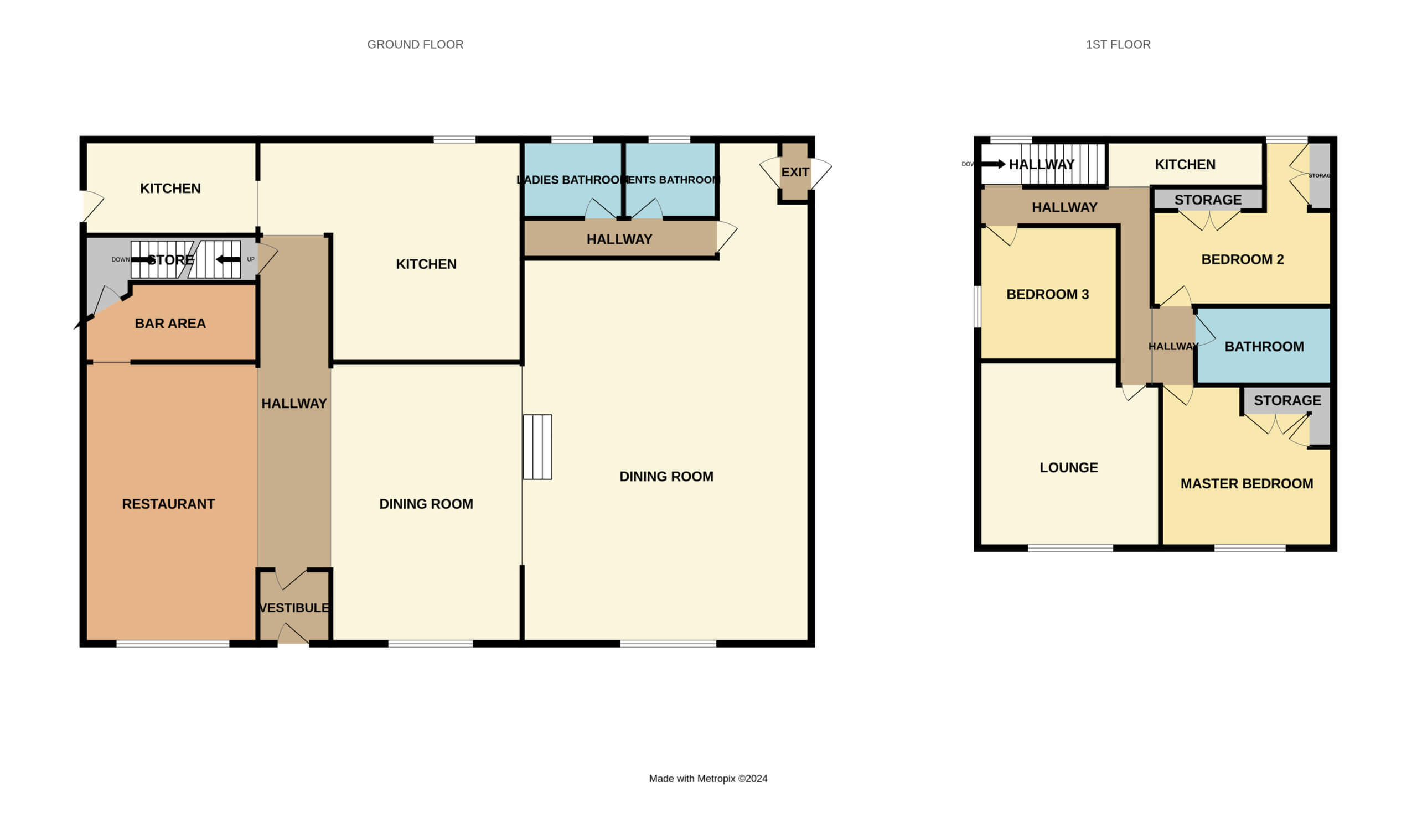The ground floor houses the restaurant itself, featuring a welcoming entrance area, spacious dining room, and bar area which creates a warm and inviting dining atmosphere.