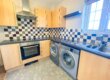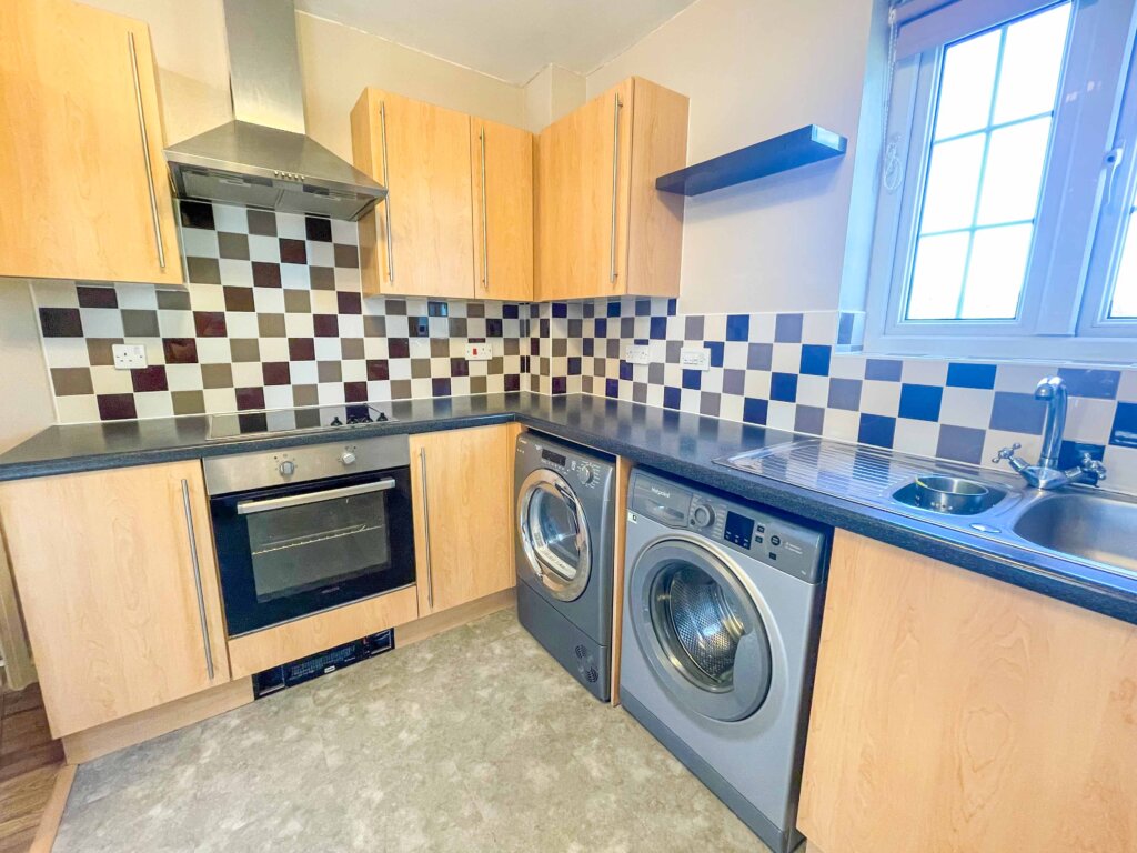 The kitchen includes a fitted washing machine and dryer, standalone fridge/freezer and amply cupboard storage space.