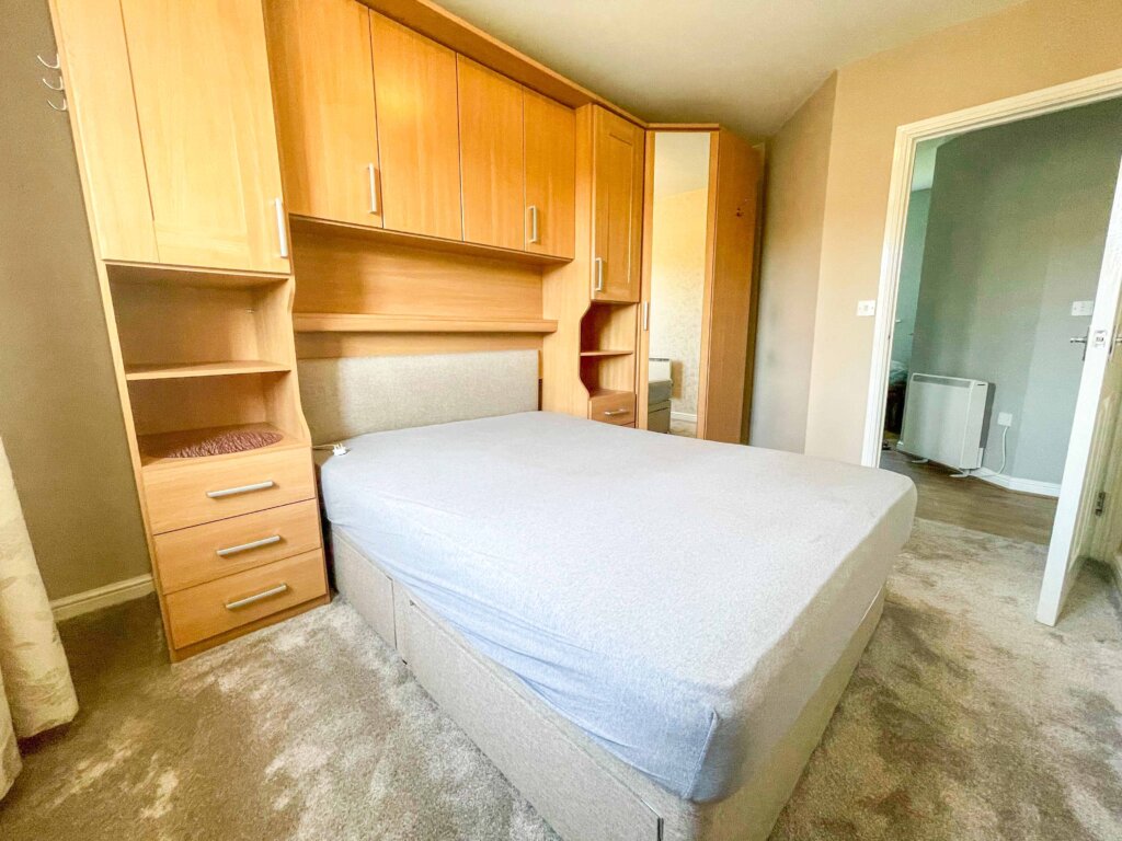 The master bedroom has fitted wardrobes surrounding the double bed..