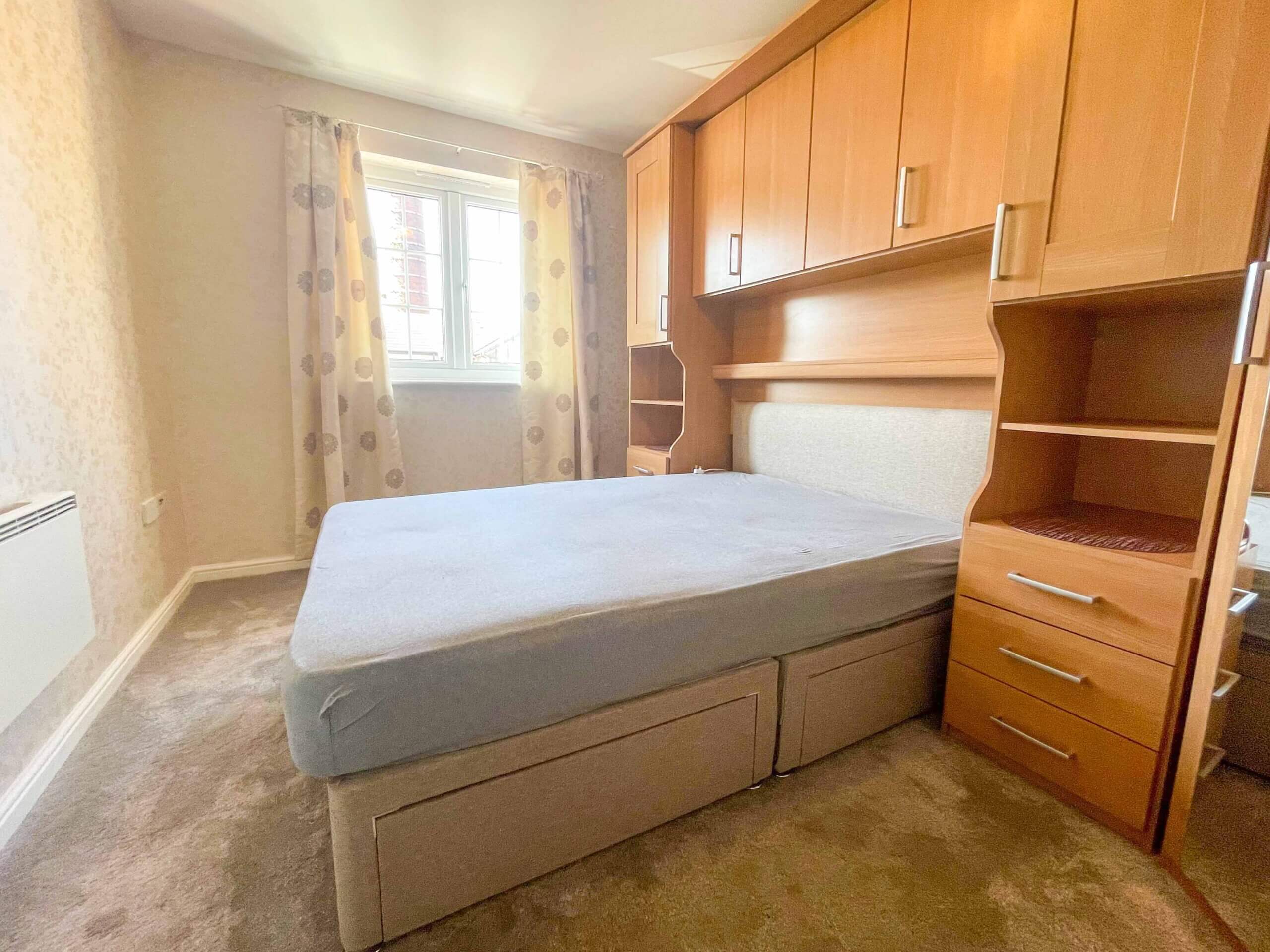 The master bedroom has fitted wardrobes surrounding the double bed..