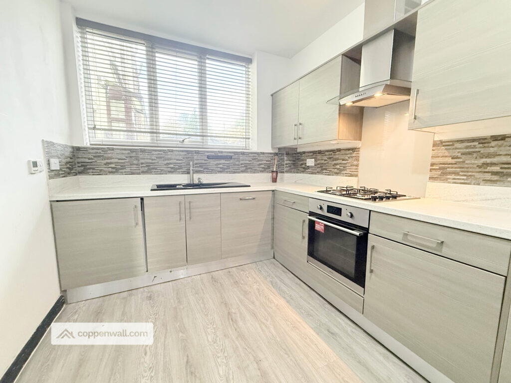 This contemporary kitchen also offers ample worktop space and storage cupboards, with a clean and practical layout suitable for everyday cooking and dining.