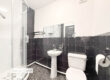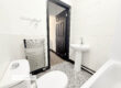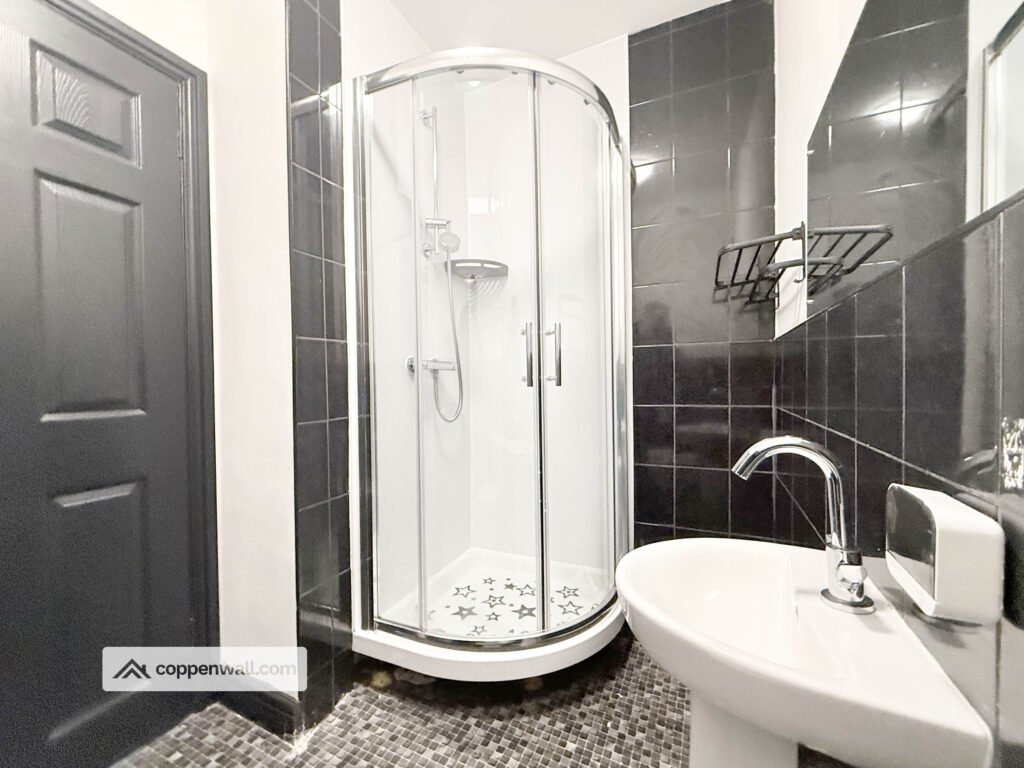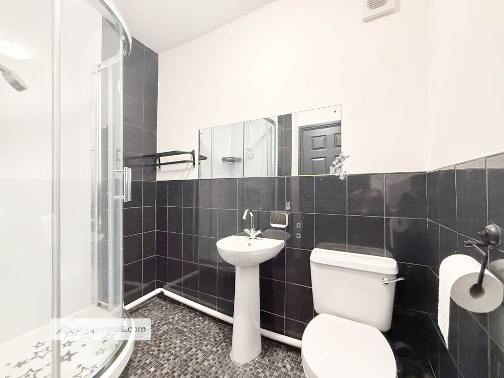 Corner shower, sink and WC. Finished with modern fixtures and neutral décor, providing a fresh and functional space.