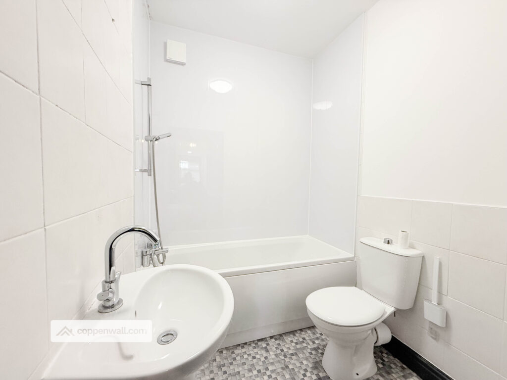 Matching modern 3 piece bathroom suite. Includes a bath with overhead shower, wash basin and WC. Decorated in a contemporary style with practical finishes for everyday use.